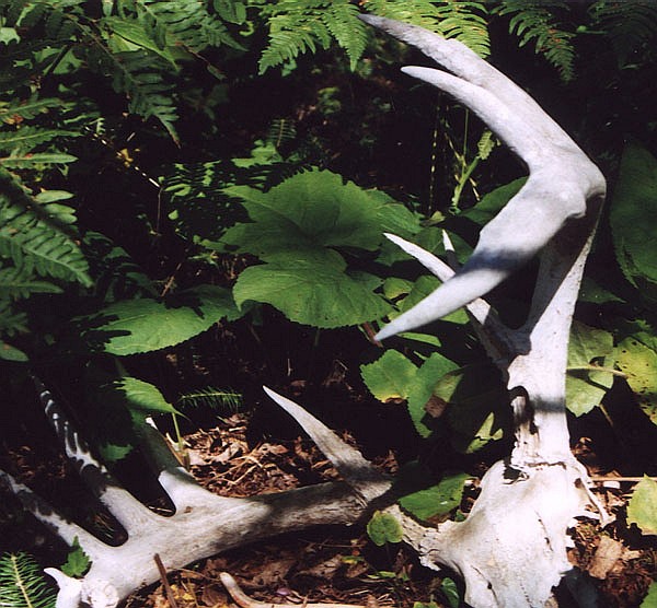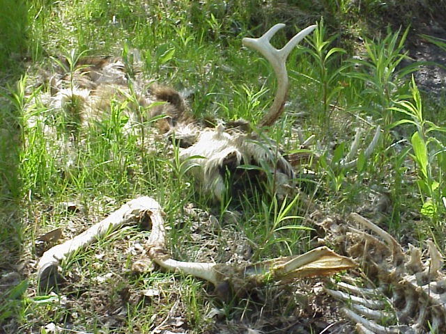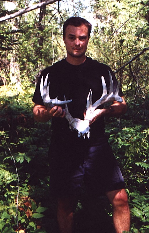 August 2002. Mike Lindquist discovered this big buck while camping in the Superior National Forest. This 12-point mainframe died of old age. The rack scored 148 3/8" and had lots of character: stickers all over the bases, bladed points, split tines, non-typical growth starting out of the main beams and lots of mass.