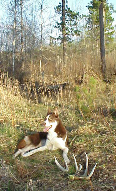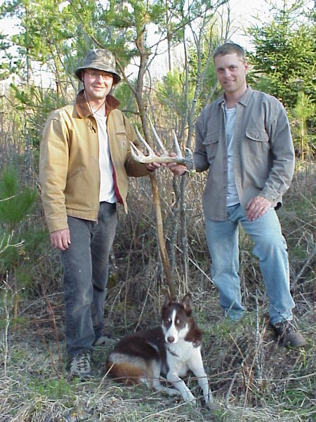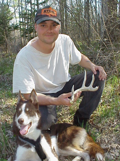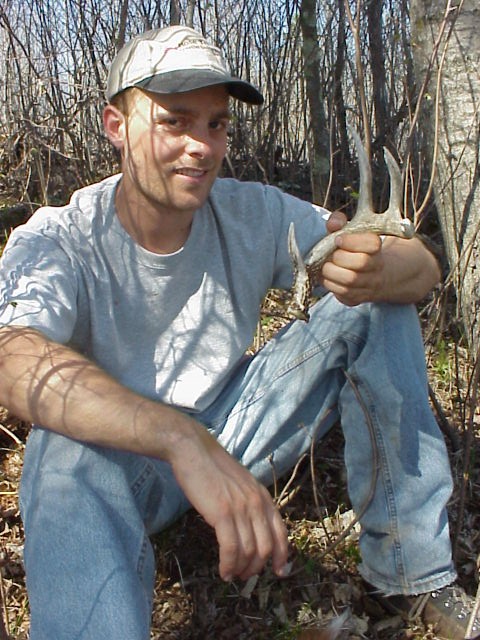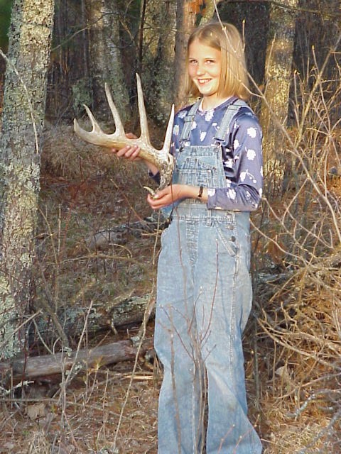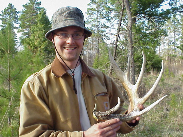 May 2002. Matt, Mike, Hannah and Lena came across this giant, year-old whitetail shed while spring scouting in a secluded buck hermitage near Park Rapids, MN. With a single antler score of 74 5/8" inches typical, it puts this monster in the 165"-170"class. That's Boone & Crockett. This is close to the largest shed antler found in Clearwater County. With any luck, this big guy is still on the hoof, adding mass.