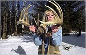 February 2002. Stephanie Potter found a dandy matched set on the North Shore near Two Harbors. Nearly a year had gone by before she was able to complete the pair. Now that's determination! This giant set scores 1511/8". You add an approximate spread of 19" and you've got a Boone & Crockett buck. Great find!