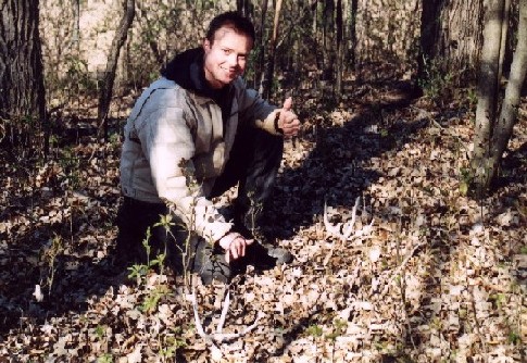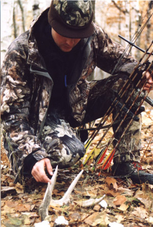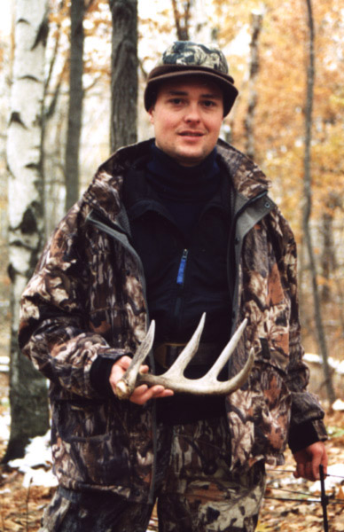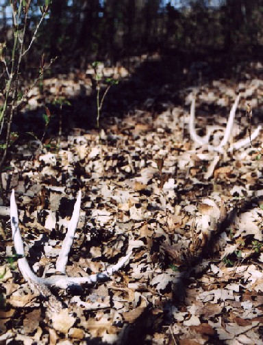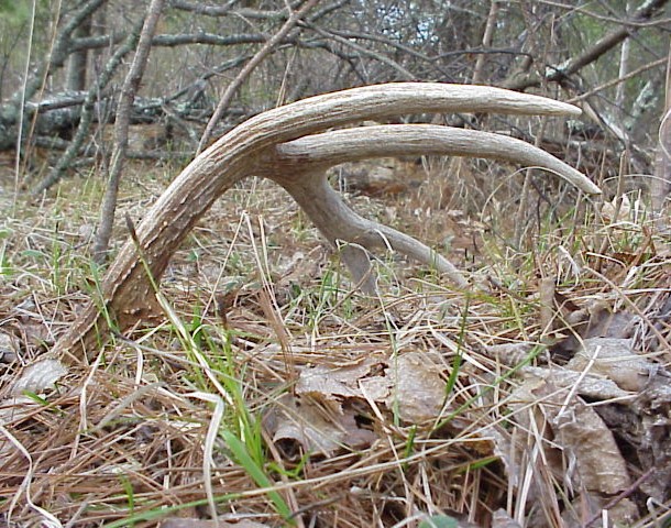 October 2002. While bowhunting in Camp Ripley, Mike Lindquist located this nice shed antler in the leaf-covered forest floor. Although it's still a younger buck, it demonstrates a thick base, a distinct characteristic of the Ripley herd.