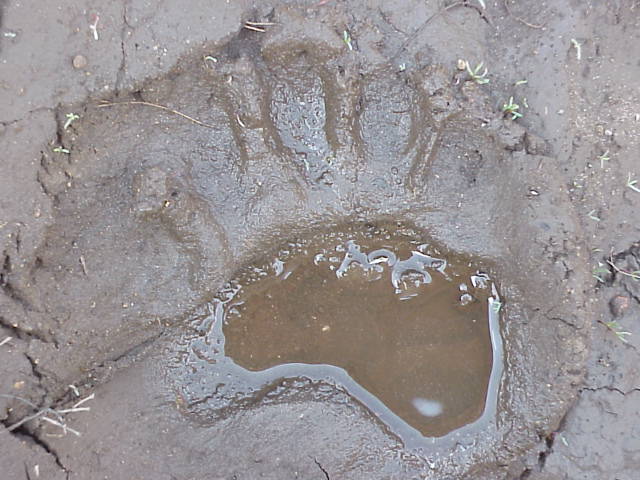 April 2002. Check out this black bear track, spotted by Hannah Miller near Park Rapids, MN. Uncle Tim caught site of him last spring and pegged him at about 300 pounds, give or take - a real bruin. We'll probably get after him one of these years.