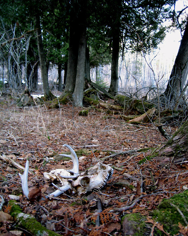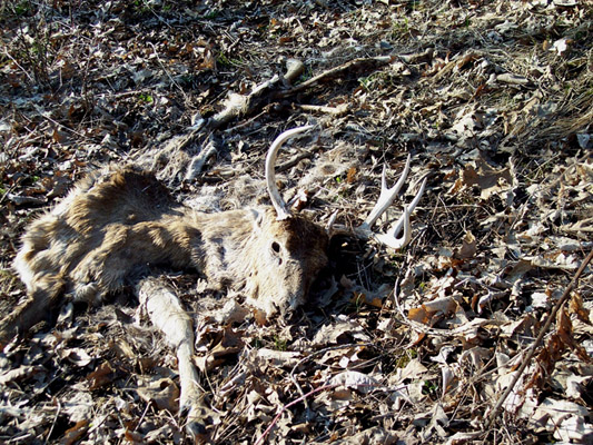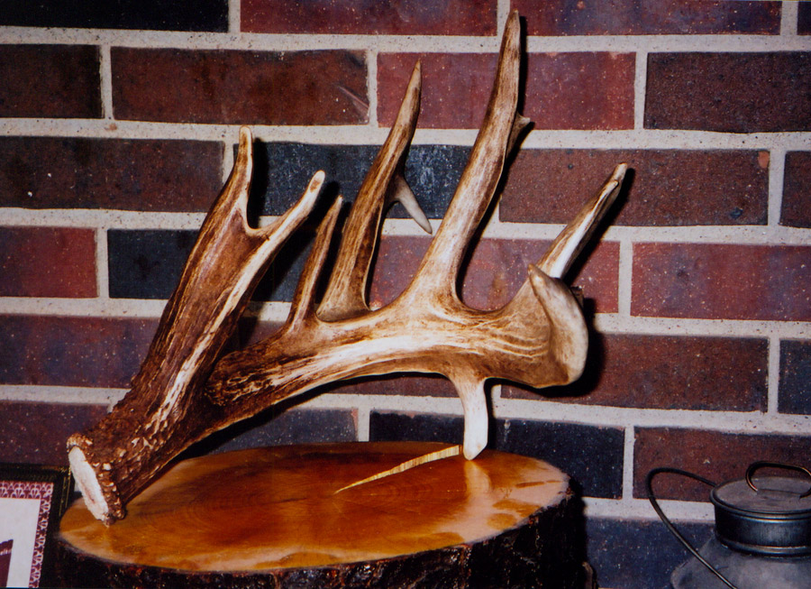April, 2006. After an ice fishing trip in the Boundary Waters, I wanted to walk some woods and stretch the dog's legs before the long drive home. I guess I picked the right piece of woods as I cruised up to this dandy matched set. Big, fresh and brown; what a magnificent animal. Check out that right brow tine! That thing could be used as a masonry tool. Even with the busted left G4, this set scores 148". You add a conservative 20-inch spread and you're talking about a potential Boone and Crockett buck. I have this same buck's left side from the previous year; you can see how much he grew.