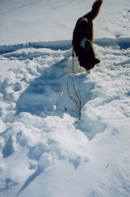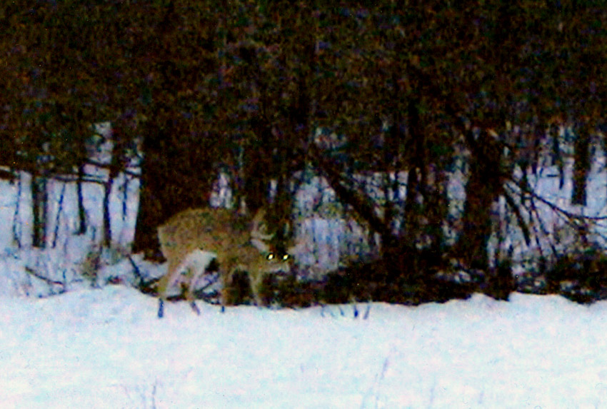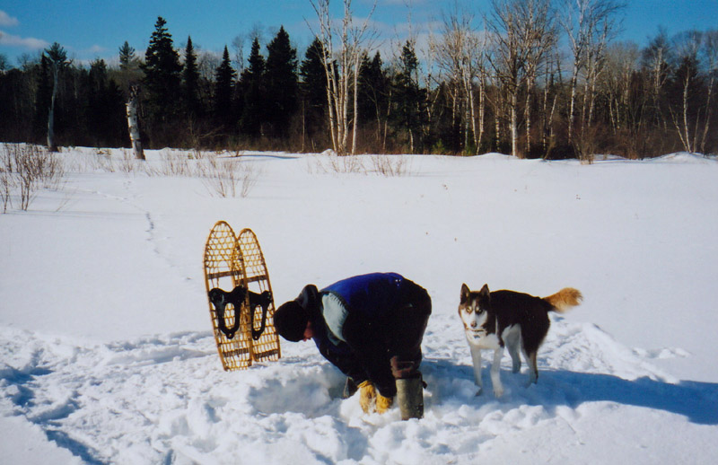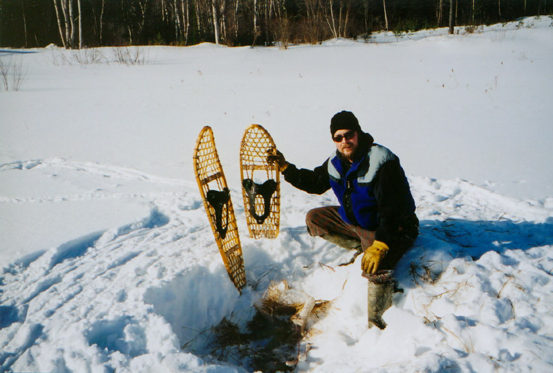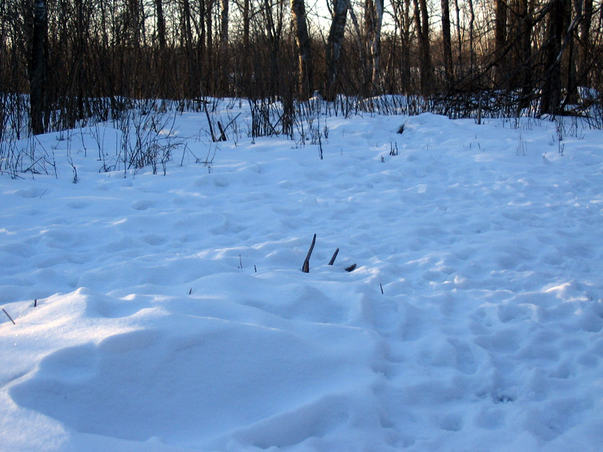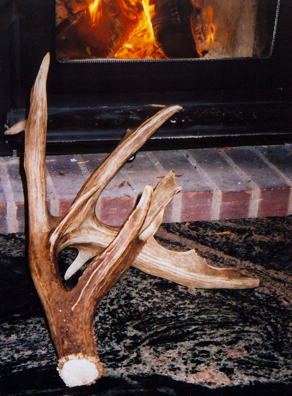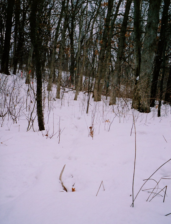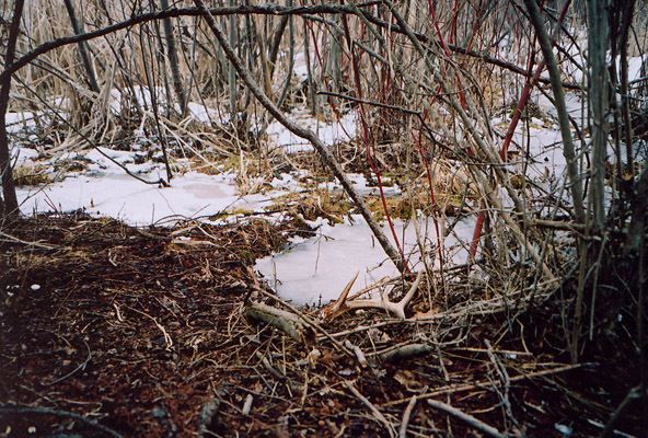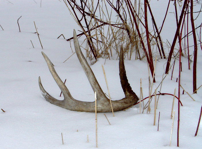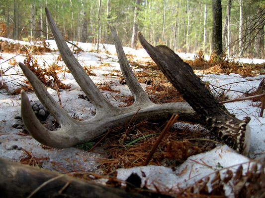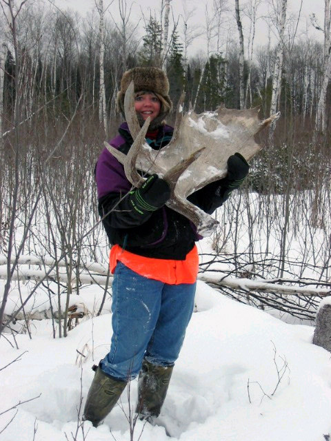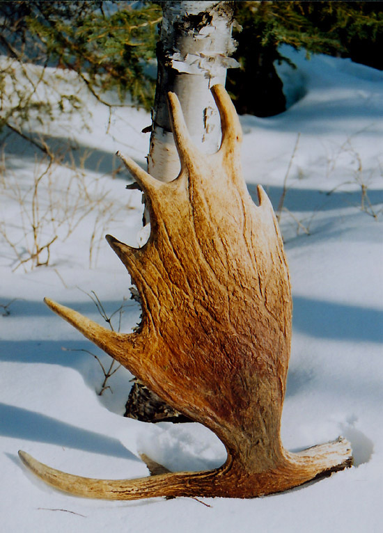February, 2006. While out snowshoeing in the northern Minnesota wilderness, I noticed a bunch of timberwolf tracks congregating to a specific spot about a hundred yards away in a clearcut. I went over to investigate, expecting to see a carcass of some kind. Upon arrival, I noticed the wolves had dug a hole in over two feet of snow to a piece of bone of some kind. I looked more closely and determined an antler tip. After excavation, it turned out to be a pretty decent, older moose antler in good shape. An amazing find, considering the conditions. The wolves found this one for me. They kept it open as a marking post, probably on the border of pack territories.