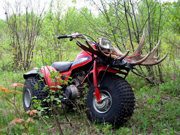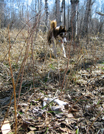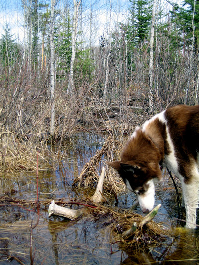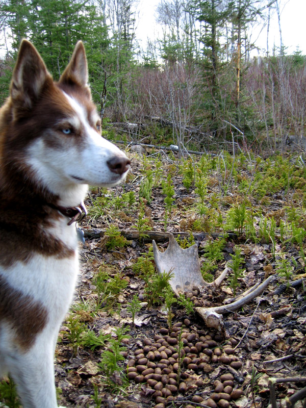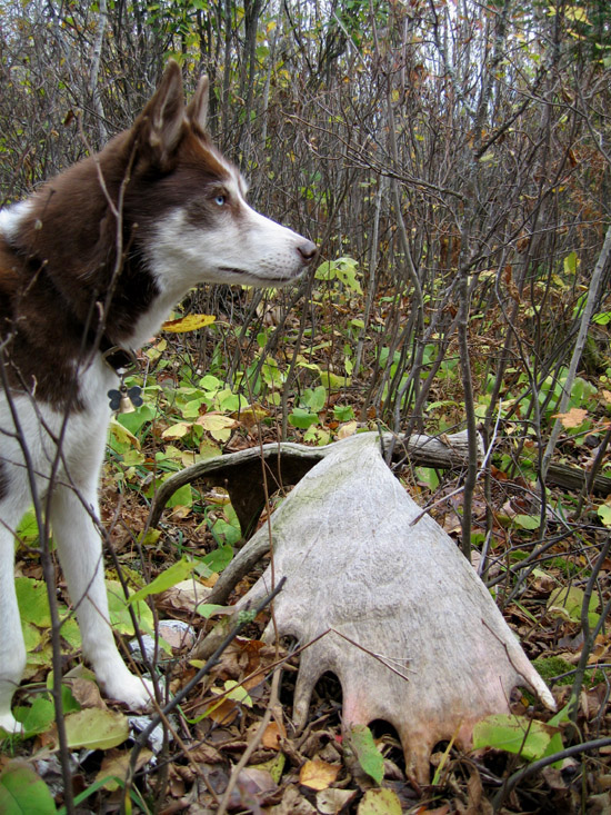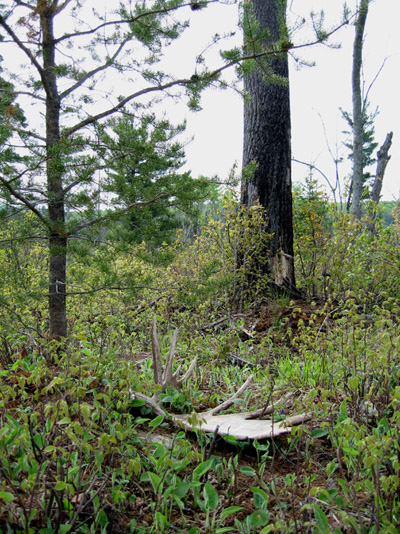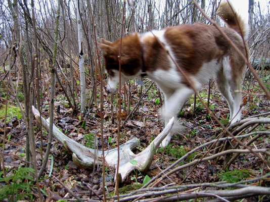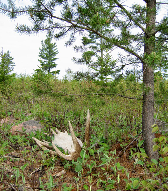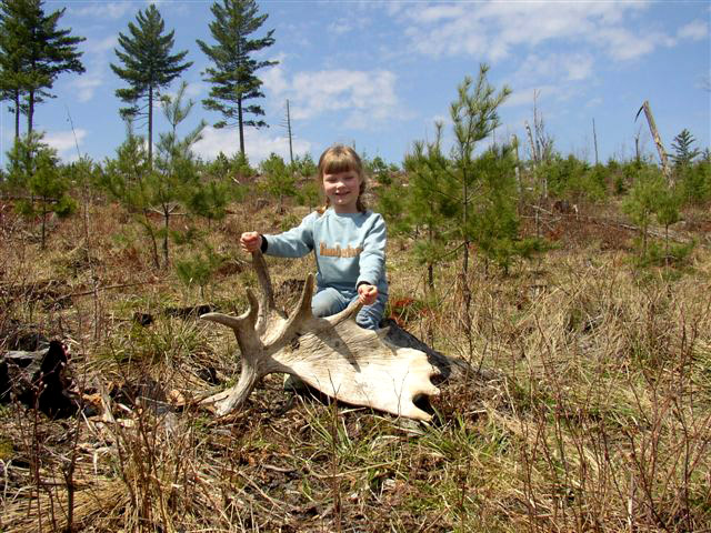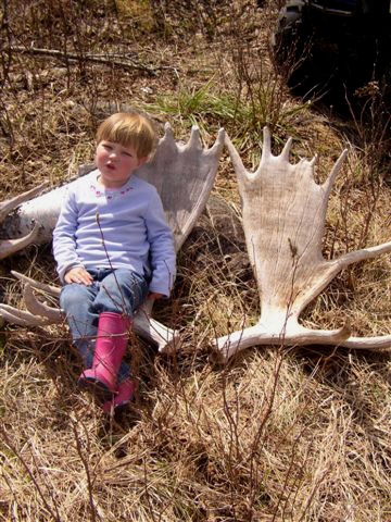 May, 2006. A recent camping trip with my girlfriend, uncle and his family produced quite an impressive stack of antlers in Minnesota's moose country. After breakfast one morning my uncle and his respective woodswomen went out and found four big sheds. Sophie and Maude both found their first ever shed antlers in the woods. After lunch we went back to the same hot zone and pulled out three more; a big year-old matched set and a really nice fresh one, all from the same giant bull. The big fresh antler is the largest moose shed I've found, measuring around 75 inches and stands up on its own. Excellent weather, great company, a beautiful location and a successful shed hunt -what more could you ask for?