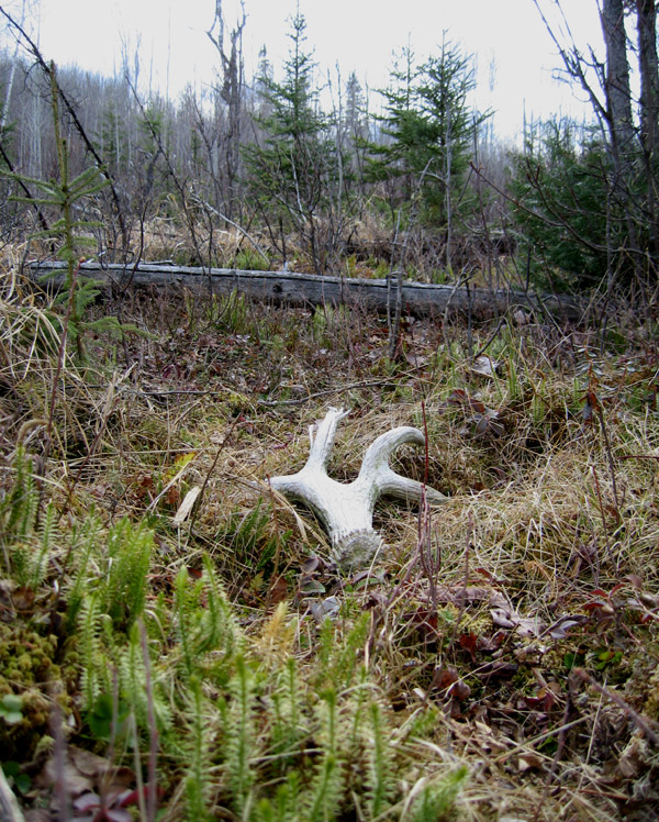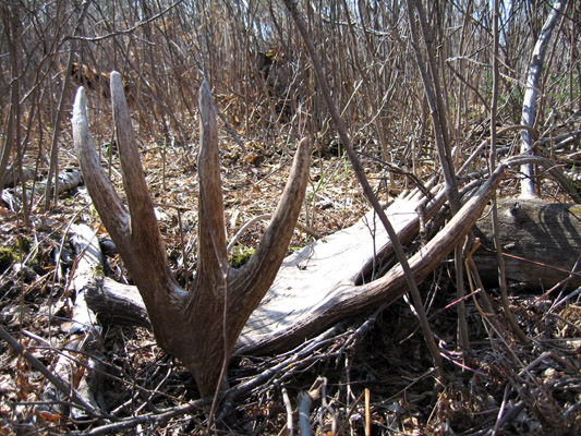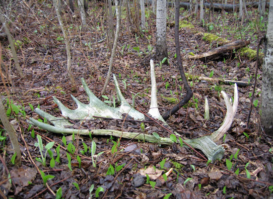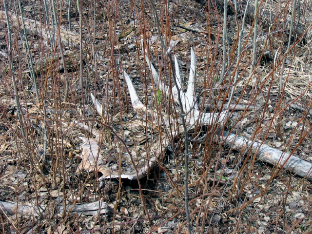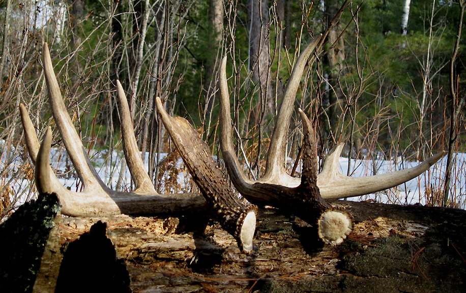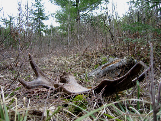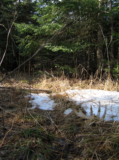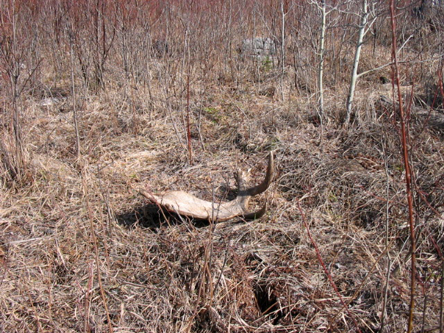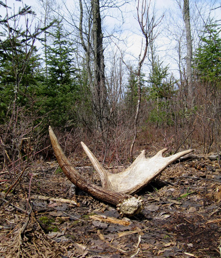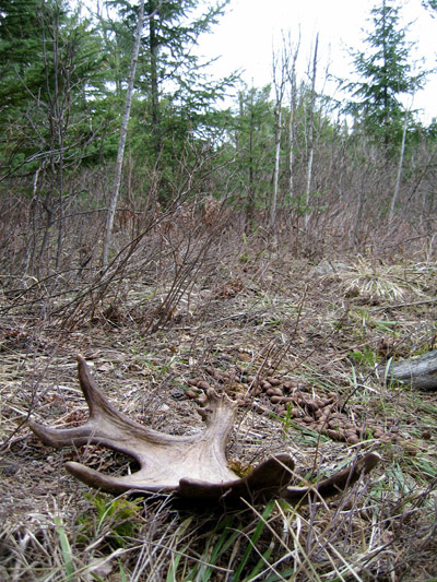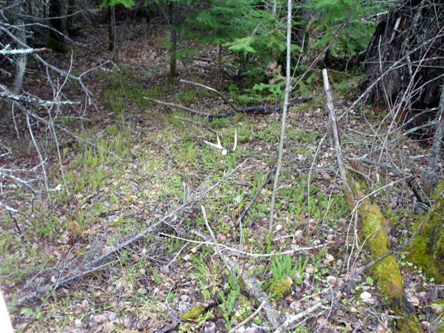 May, 2006. I had a nice couple days out in the woods before the green up takes hold. The matched whitetail set is from a buck that we've seen from the stand twice this past fall. Nice to know that he made it through the season. He'll be close to a 150" class buck this fall. A few more small moose sheds to add to the stack.