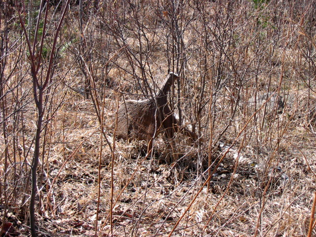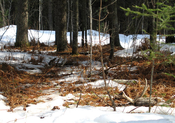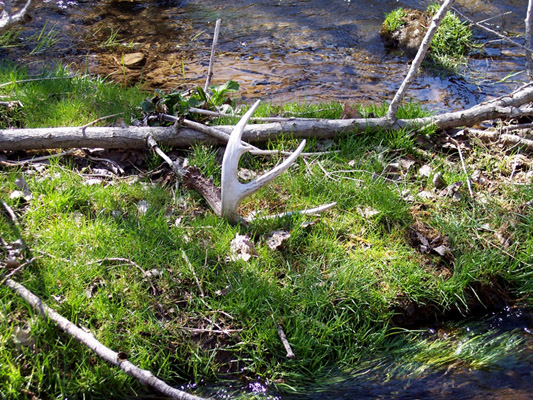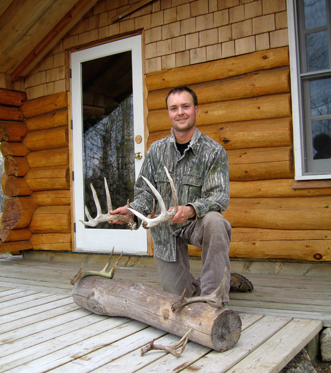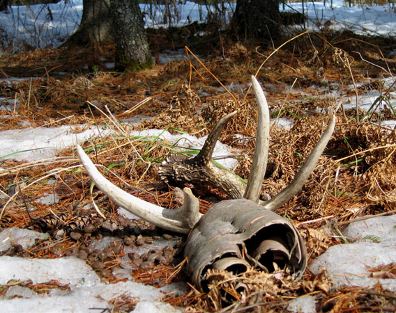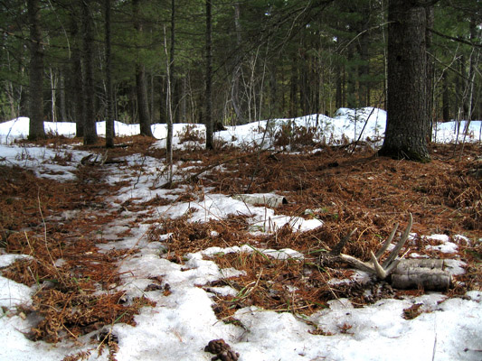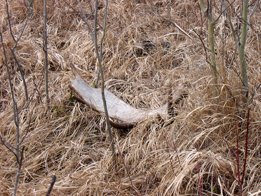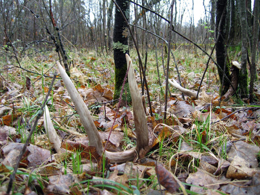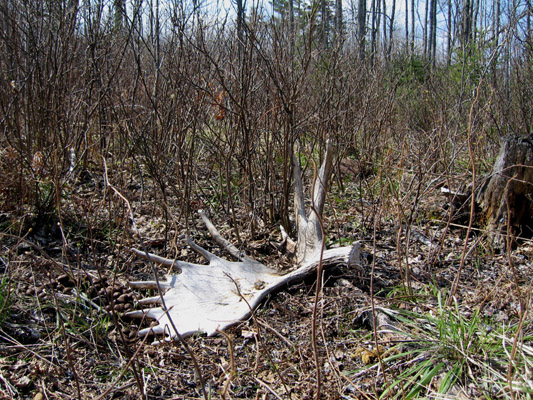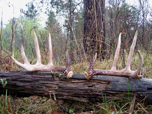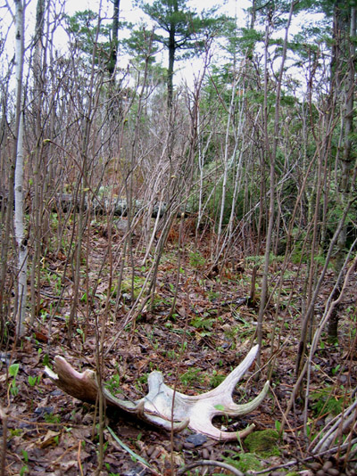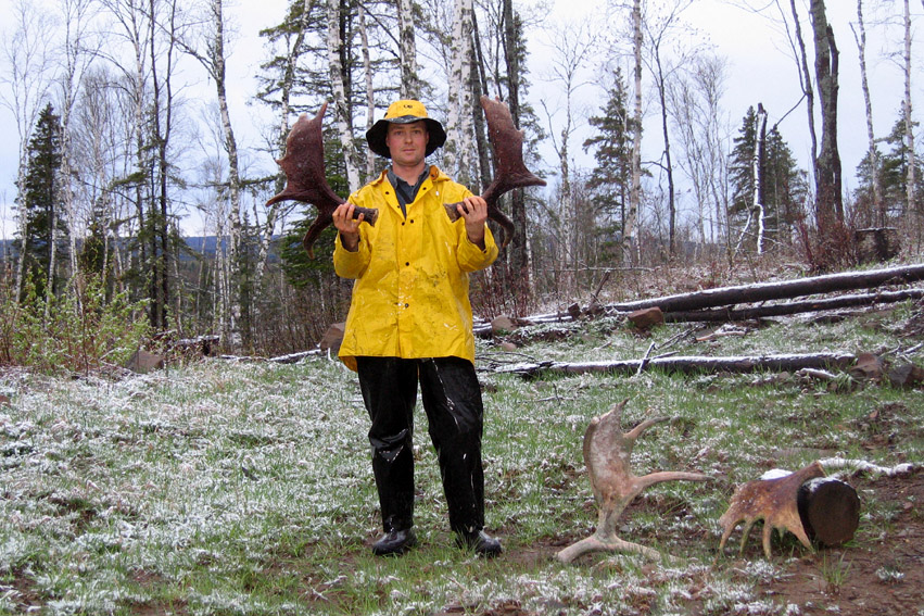 May, 2006. I had a nice couple days out in the woods before the green up takes hold. The matched whitetail set is from a buck that we've seen from the stand twice this past fall. Nice to know that he made it through the season. He'll be close to a 150" class buck this fall. A few more small moose sheds to add to the stack.