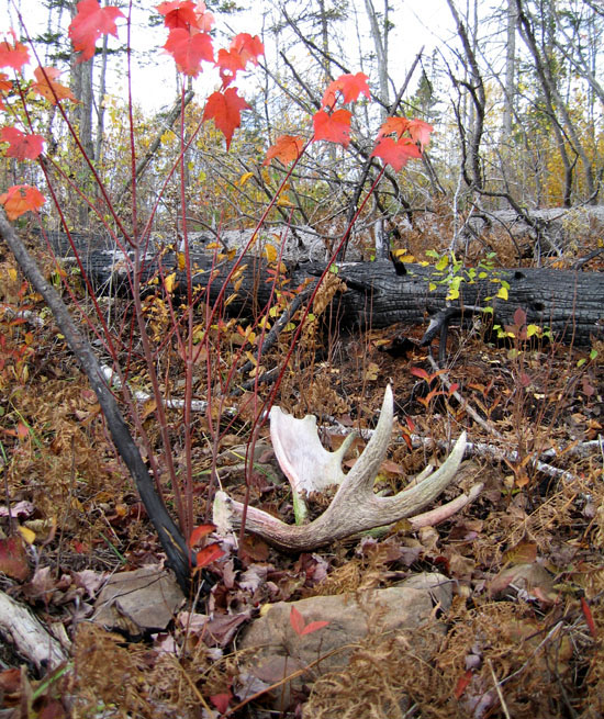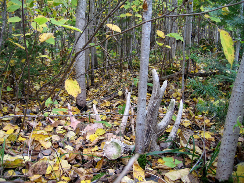 September, 2006. We wanted to spend my birthday in our favorite place: moose country. I figured we'd take a hike in a nice moosey spot that I couldn't get to last spring while shed hunting. It offered great grouse habitat as well, so I thought perhaps we'd find a bird or maybe even an antler. Turns out we chose the right spot. We picked up a couple small sheds right away and then later I found the big left side. We searched around a bit for the match but came up short. We started to head back out since it was getting close to sundown. Suddenly our dog Lena flushed a grouse. Luckily it took to a perch in a nearby tree. I found the right angle and downed the bird. As I walked over to retrieve my bounty, I locate the other side to complete the big matching set. Quite the sequence of events, especially since it was my birthday -some nice gifts from Mother Nature.