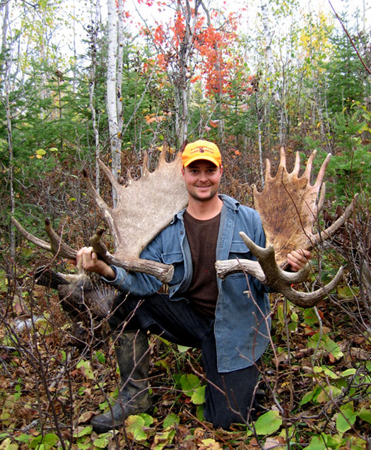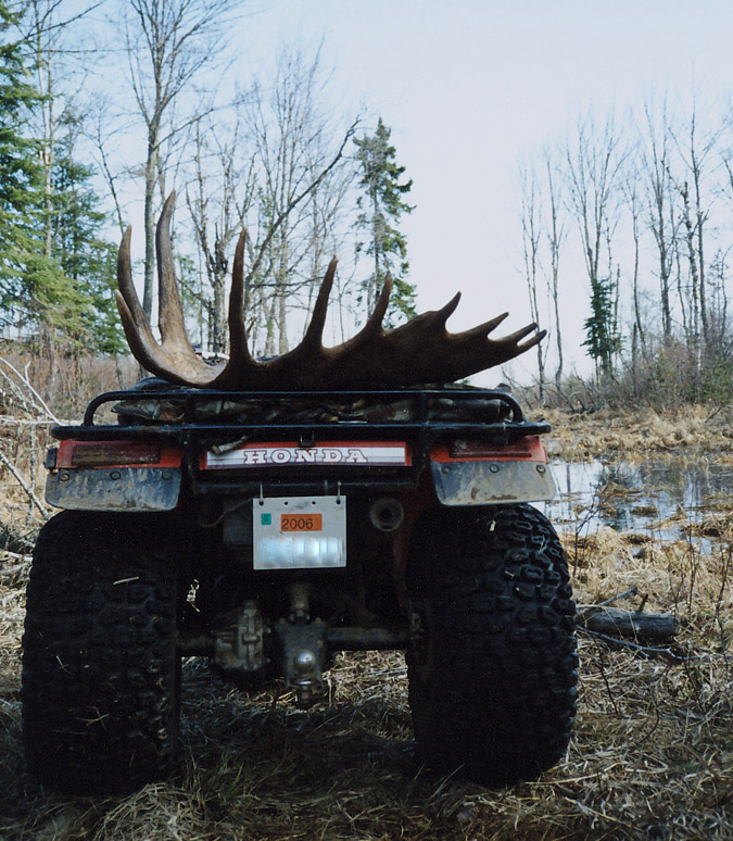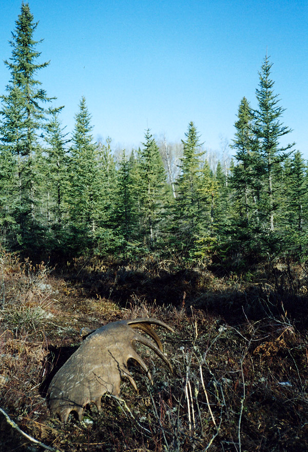 June, 2006. On what would be my last day of shed hunting for the season before heading off to work on a feature film, I set out to find a specific antler: the match to the huge shed I found in May. Although I had gridded the area fairly well already, I wasn't ready to give up. I walked in and started meandering around on the secondary moose trails and found myself drifting further and further away from the first shed location. I was trying to get in the mind of the moose and boom! there it was. It was lying in a rather unlikely spot, in a very open area underneath a large white pine, about 500 yards from its mate. After some hooting and hollering with my prize held up to the sky, thanking mother nature and such, I was out of there, happy to be done for the year. It's probably the biggest set I've ever found by a few inches or so. One antler is 67" and the other is 75".