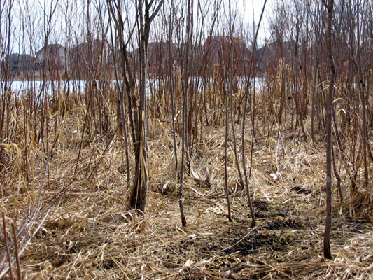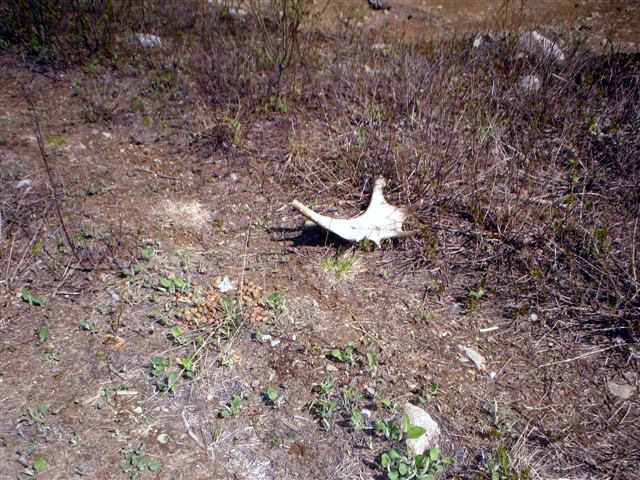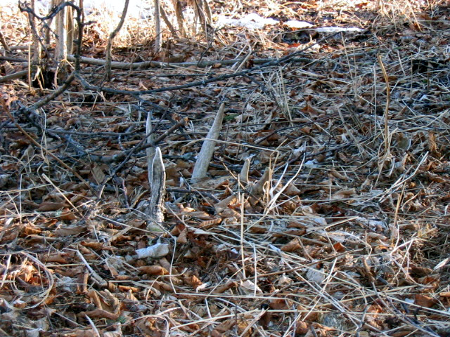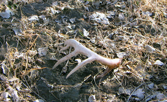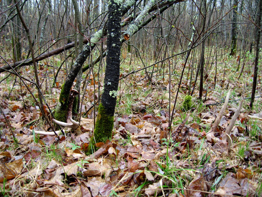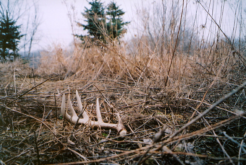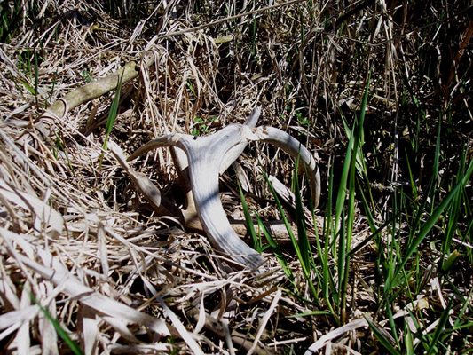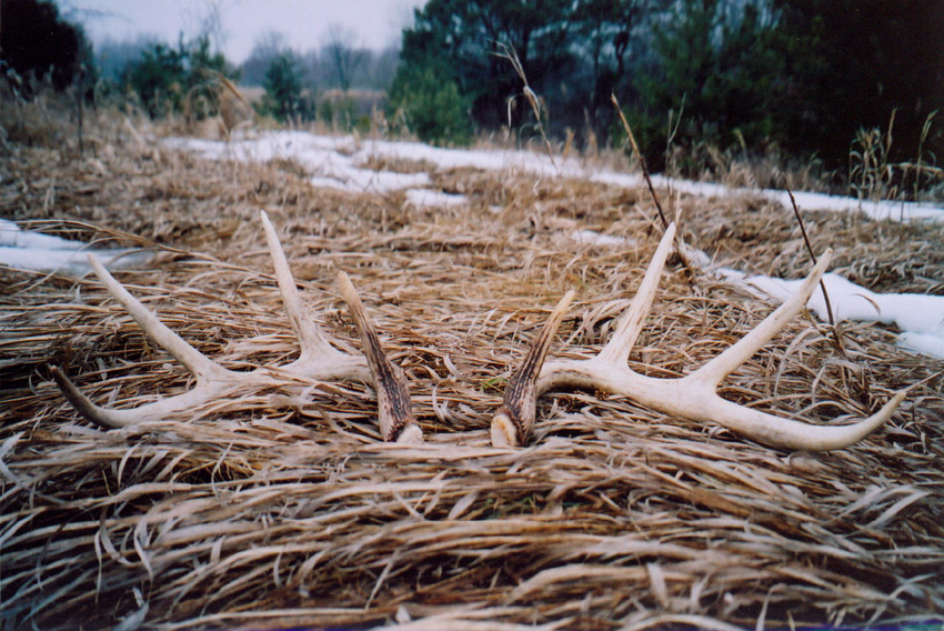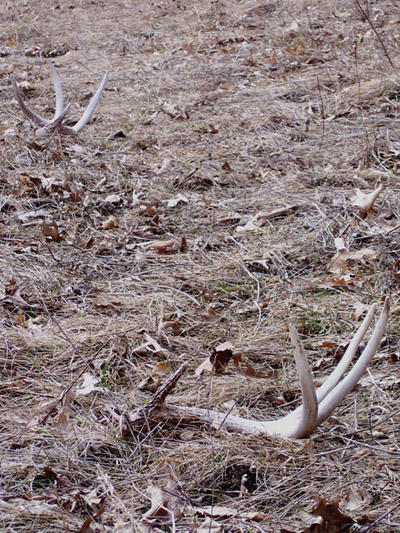 March, 2006. My first whitetail finds of the season, despite miles of searching in January and February. There's a dead 8 pointer, some small singles and a couple decent matched sets. The first set has some potential to be an awesome buck. 21 inch main beams already! The second set still has me wondering if it's really a match. I combed that area and only found those two antlers 30 yards apart.