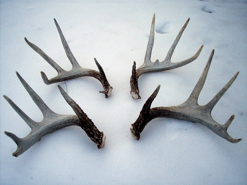 February, 2006. Here's a batch of the first sheds of the season for some antler friends of mine. A nice big paddle, a monster nontypical and a unique 7 point typical shed are among the collection.