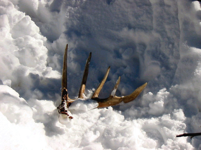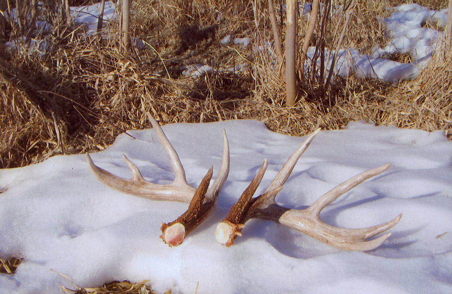 March, 2006. I've started to collect some nice sheds over the past two weeks or so. Here's a few of the more interesting ones. The first one is a unique little six point. The second one is a very fresh little four point shed on top of two feet of snow. The third is a cool matched set, with one of the antlers busted off just after the brow. The last two antlers are both nice five points weighing in at 65" and 67" respectively.