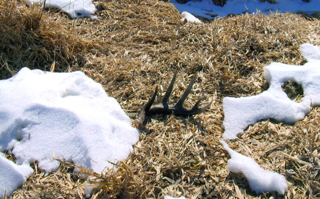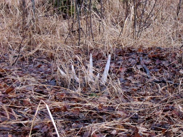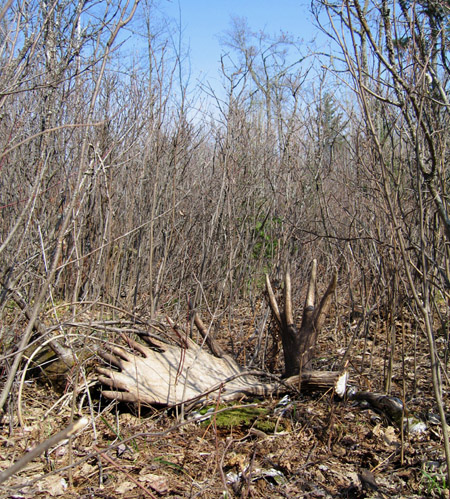 May, 2006. Two days in moose country yielded 11 sheds. When the snow shower hit, I was thinking it would sure be nice to have something to photograph in the late season squall. I turn the next corner and there's a little matched set just waiting for me. Kind of like a shed hunter's snow globe I guess. Most of the others are bleached and white, but there's some good size to some of them. The matched set sports quadruple brow tines. There's even a big old shed that a birch tree fell on.