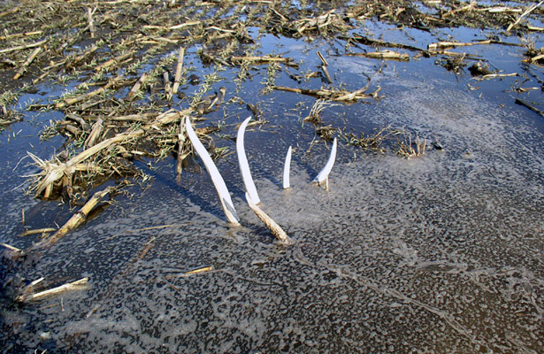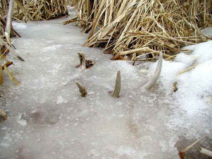 April, 2006. This is a nice batch of shed antlers sent in by a few different friends of Minnesota Bucks. The first antler was spotted from a long distance away and ended up taking third place at the recent Minnesota Deer classic, measuring 80 3/8". Nice tine length on that buck. The third photo is about as nice of a four point shed as you'll see, scoring 64". The next three are some great year old sheds. The last two photos are of the same big six point. Note the hoof print pushing the antler tip further into the snow. A buried shed like that can be tough to spot.