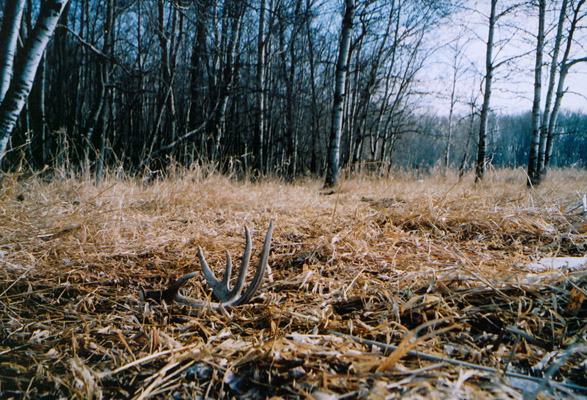 June, 2006. A friend of Minnesota bucks sent in this nice collection of whitetail and moose sheds. Some nice ones in the group and some great spotting on those tough-to-see antlers. Check out the base on that last moose antler. Cool, eh?