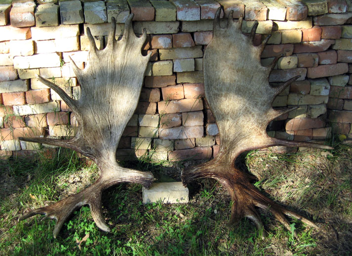 April, 2006. My first couple forays into moose country produced a few good antlers. There's a few nice old deer antlers in the mix, the bigger one was found by a friend of mine from up north. Even with the chewing and decay, they score 63 and 81". A few nice fresh moose antlers in the group, nothing huge, but even a small moose antler is a keeper.