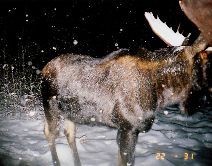 April, 2006. Jim Price found a few really nice antlers on a recent trip into moose country. The first set was unique in the way they were propped up next to each other, so close and so oddly positioned. The last one is a giant shed with a pretty wide palm and nice distinct points. Not too bad of a weekend!