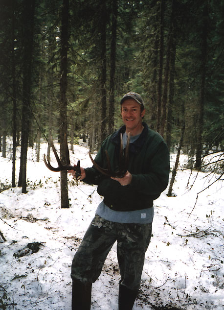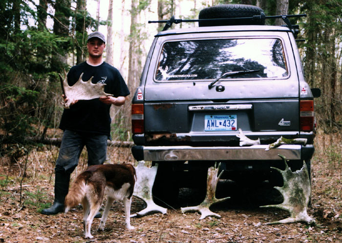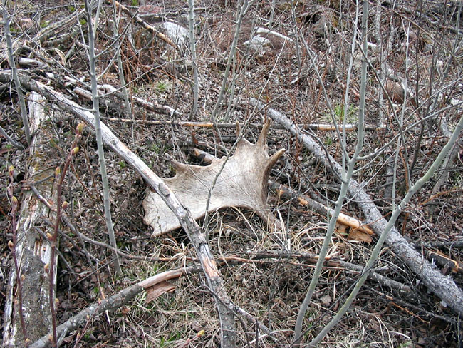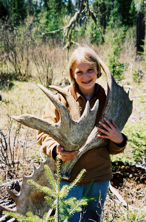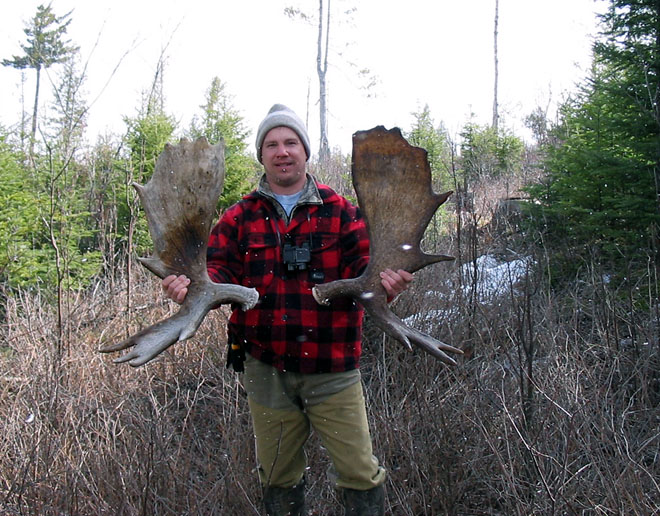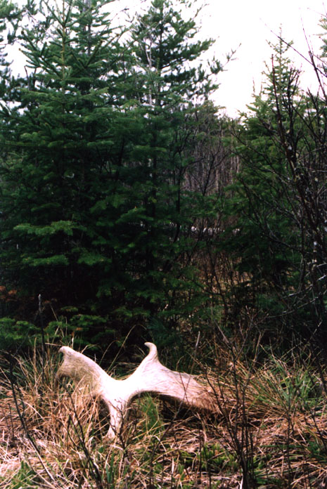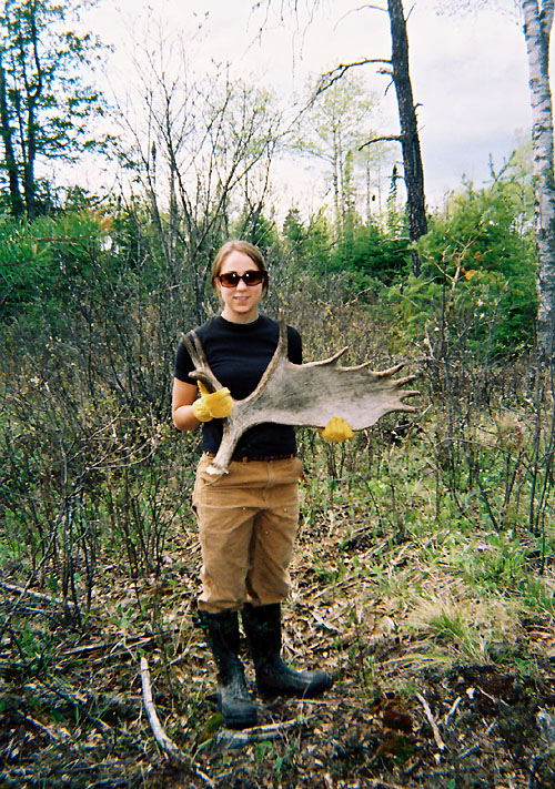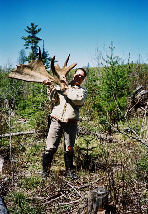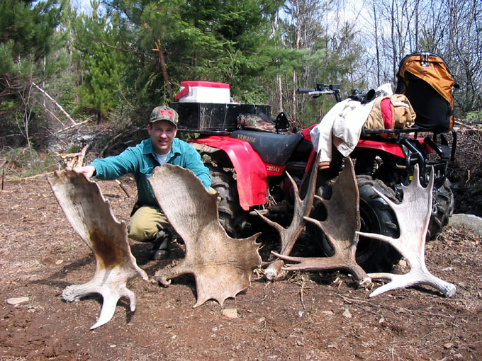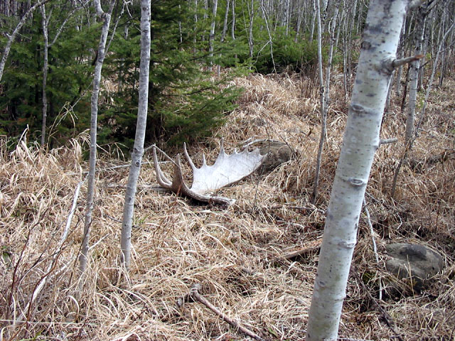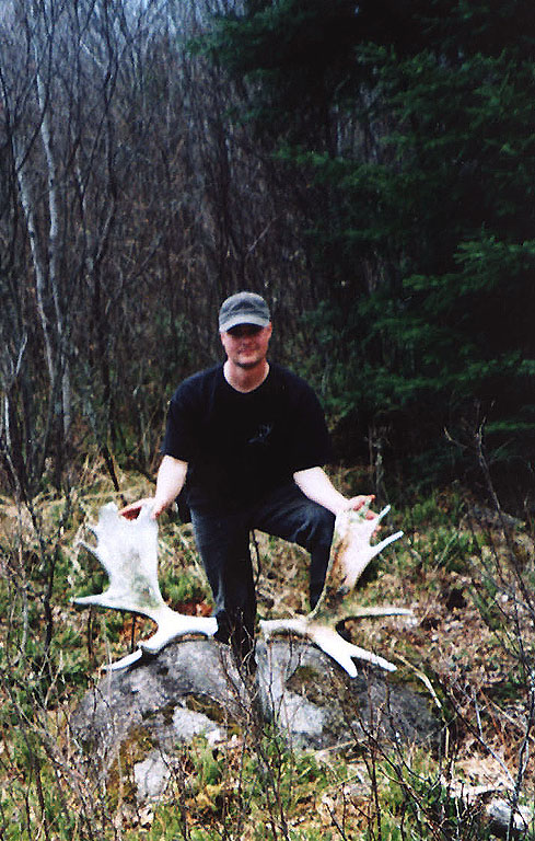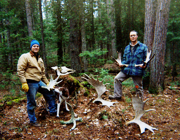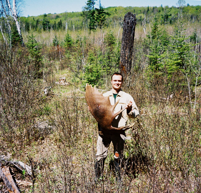 April, 2004. The Potters found a good spot here that produced three nice moose antlers. Chris holds the match, found fairly close together. It's a year old, but in excellent shape.