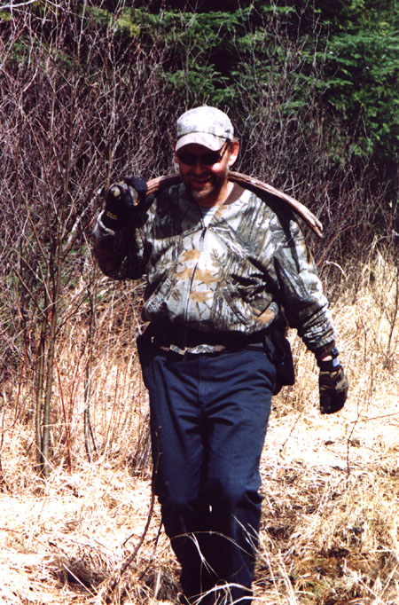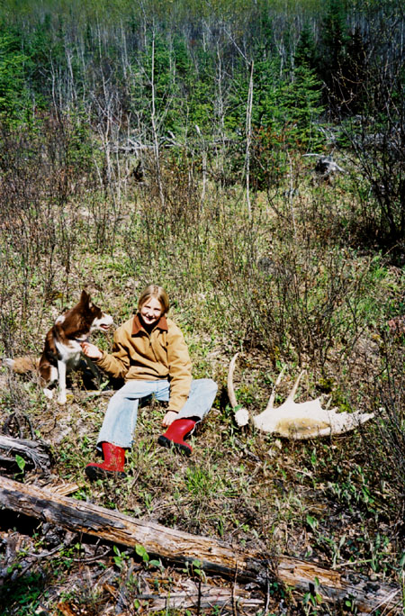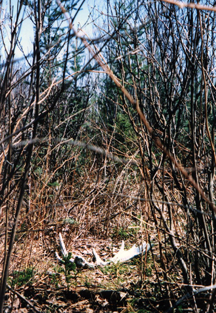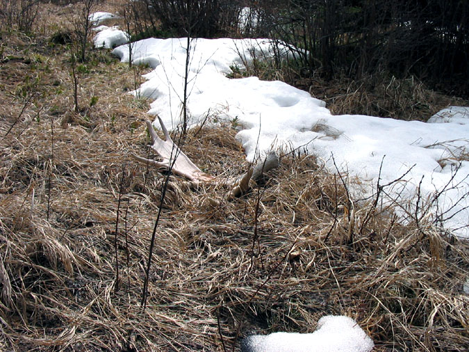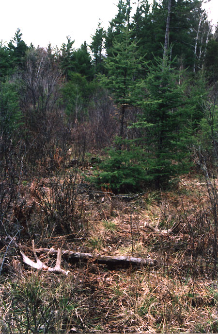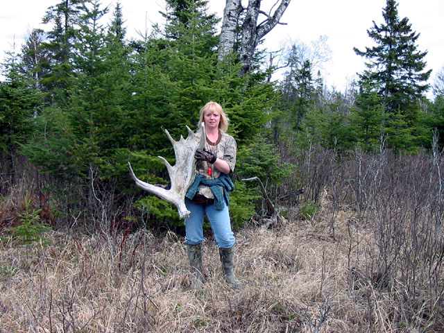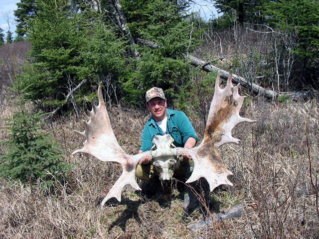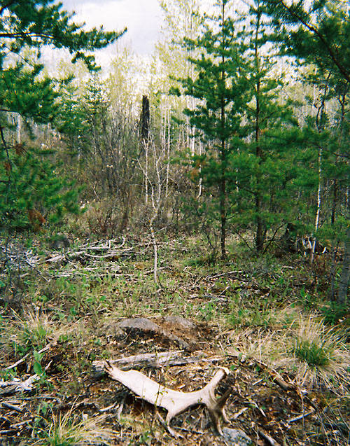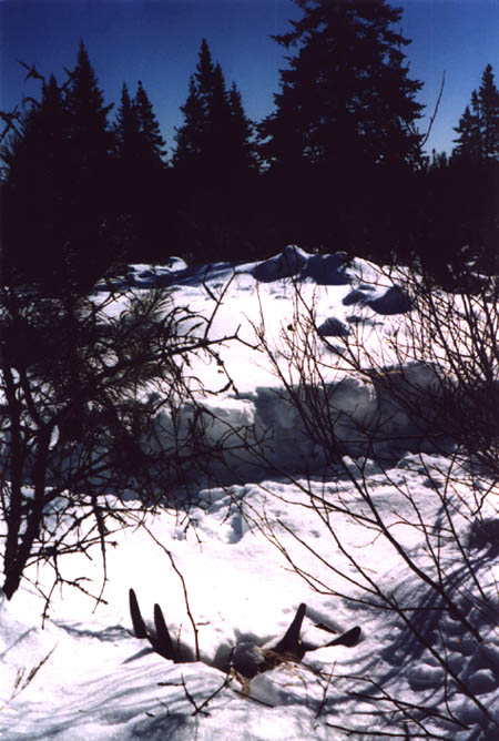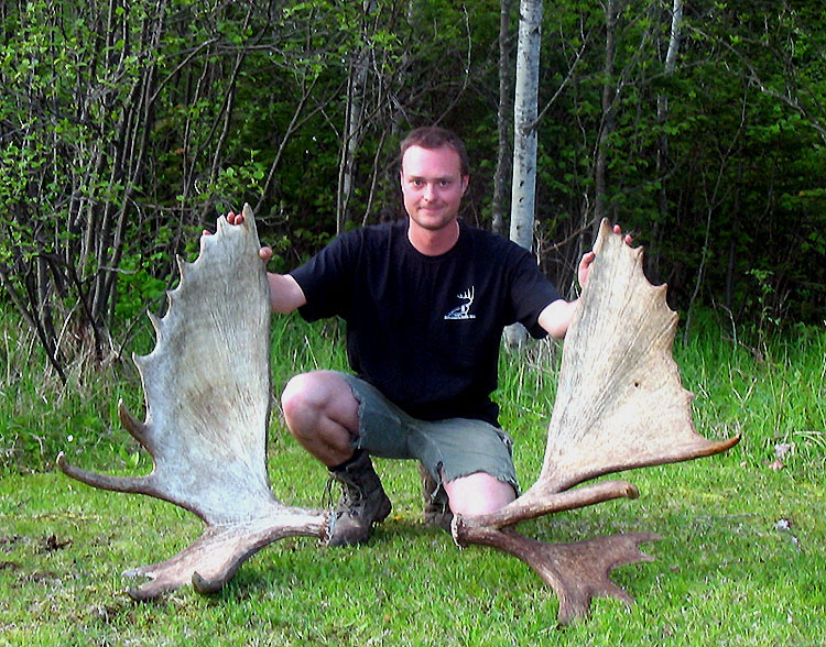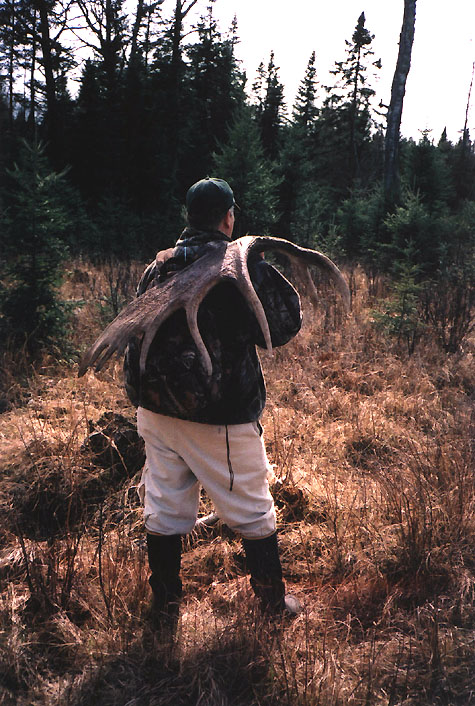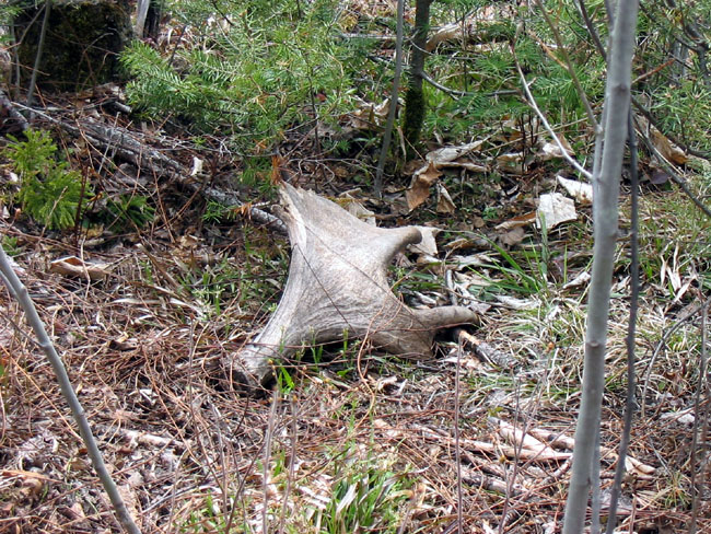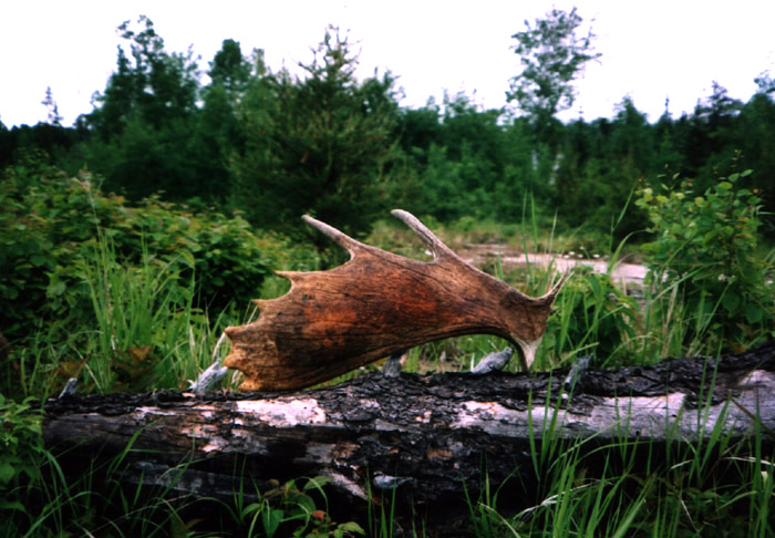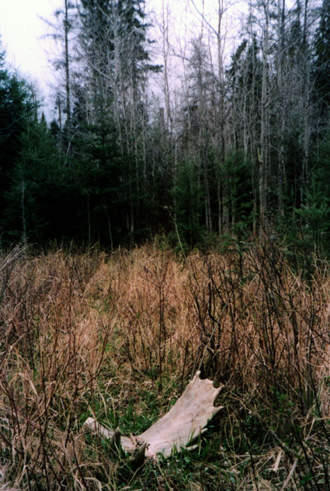 April, 2004. The Potters found a good spot here that produced three nice moose antlers. Chris holds the match, found fairly close together. It's a year old, but in excellent shape.