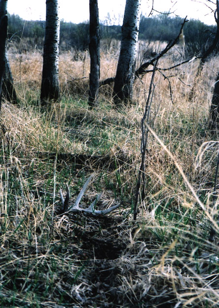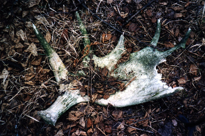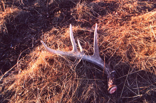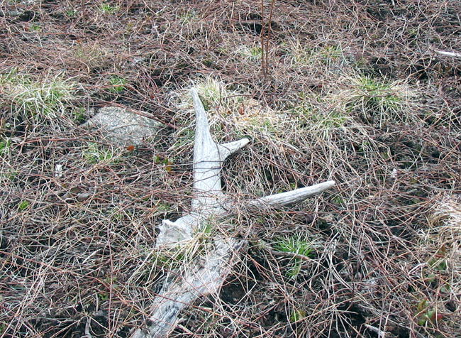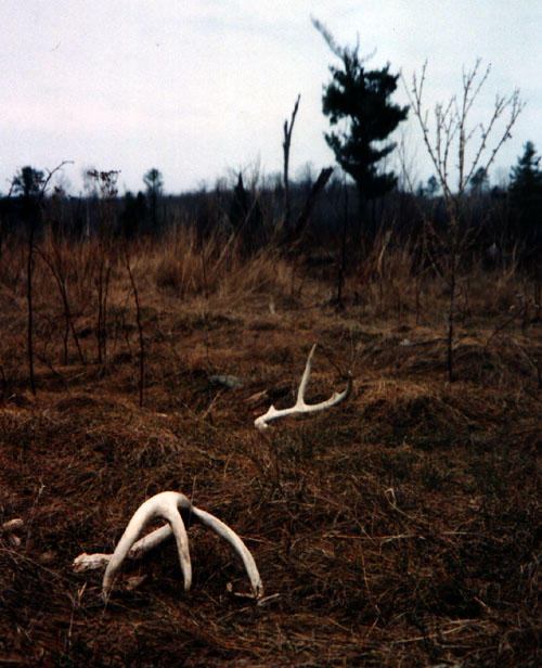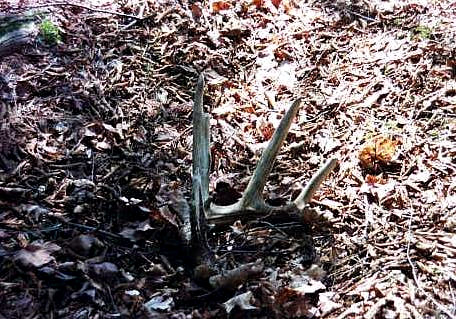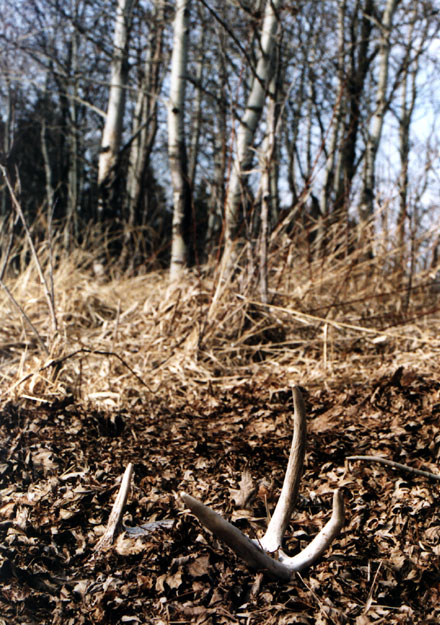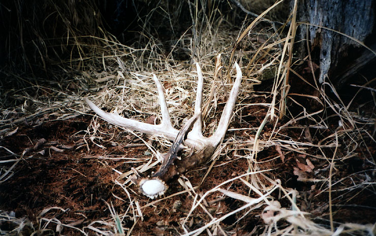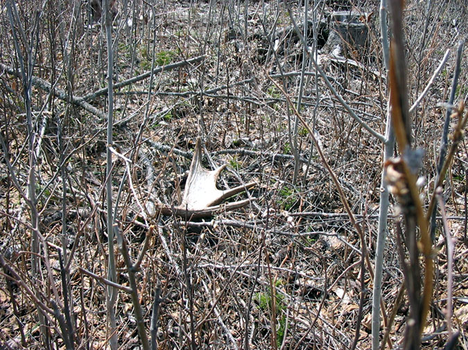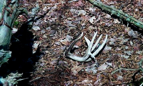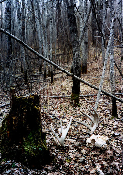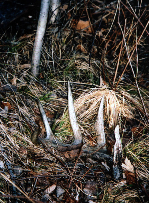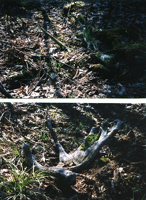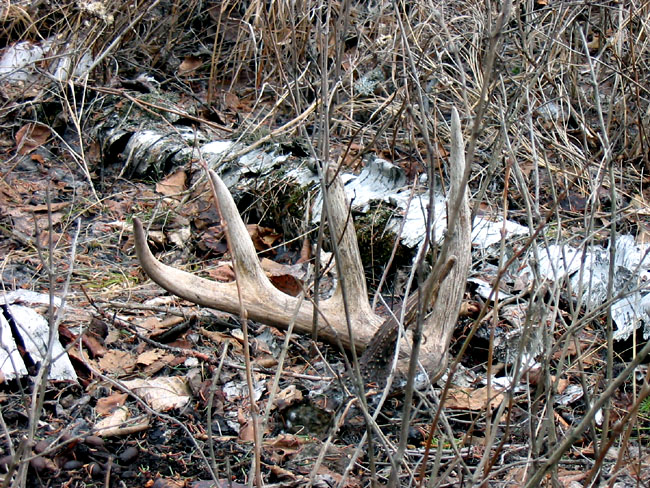 April, 2004. Here's a collection of antlers and a skull Mike Lindquist came across while shed hunting near Itasca State Park. These are bucks that are, or have been in the vicinity of our hunting shack. It's nice to get a gauge on what caliber of whitetails are out there in the hunting woods. The matched set is unique: no brow tines. Another good set of rattlers. Both my brother and I have seen the 8 point skull buck at some point while deer hunting. With the full rack, he'd score 116 7/8". The fresh 4 point antler is off of a buck from a trail camera photo. It's a shade under 50" with great color. The last three images are good exercises in shed hunting; can you spot the shed antler?