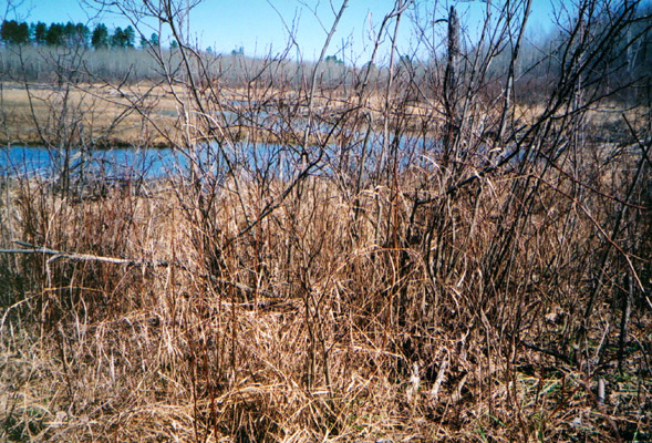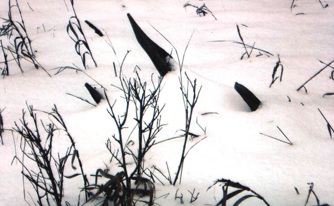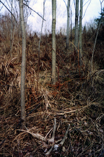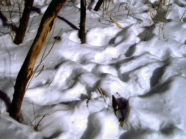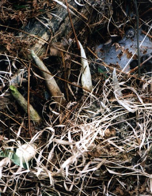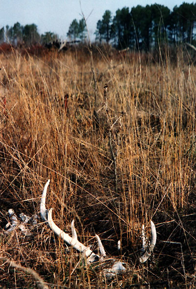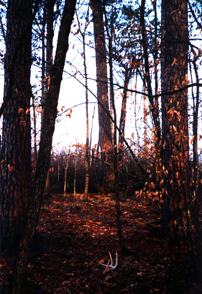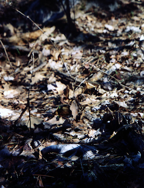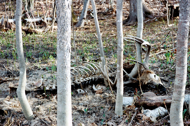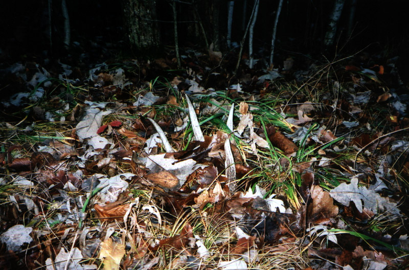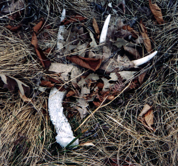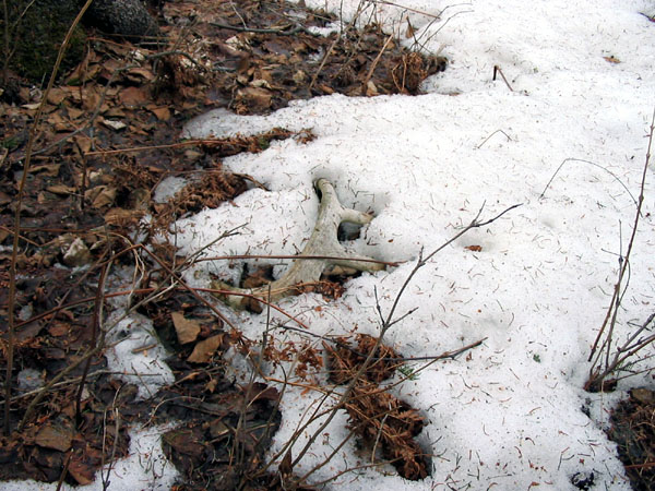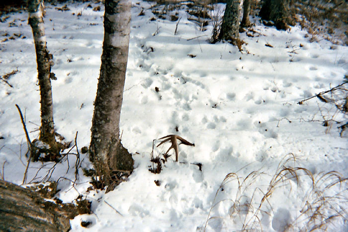 April, 2004. Here's a collection of antlers and a skull Mike Lindquist came across while shed hunting near Itasca State Park. These are bucks that are, or have been in the vicinity of our hunting shack. It's nice to get a gauge on what caliber of whitetails are out there in the hunting woods. The matched set is unique: no brow tines. Another good set of rattlers. Both my brother and I have seen the 8 point skull buck at some point while deer hunting. With the full rack, he'd score 116 7/8". The fresh 4 point antler is off of a buck from a trail camera photo. It's a shade under 50" with great color. The last three images are good exercises in shed hunting; can you spot the shed antler?