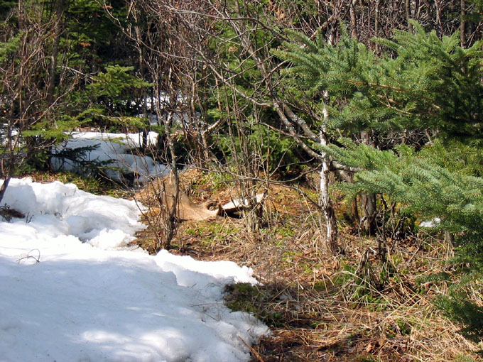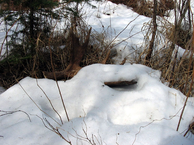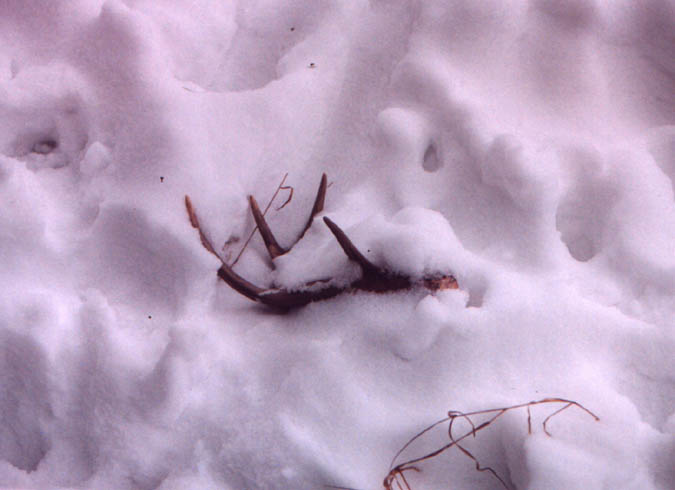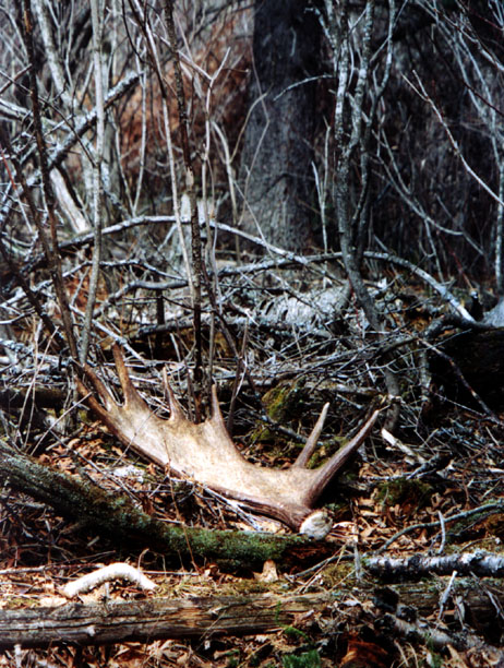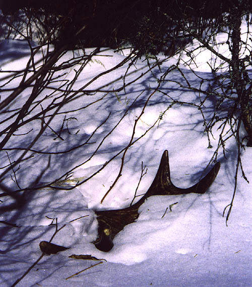 February 2004. I went out one morning and saw a bull on the road, licking salt. I noticed he was only carrying his left side. I strapped on the snowshoes and started tromping around in the woods to see what I could come up with. After an hour and a half of tough shoeing in 36 inches of snow, I managed to scoop up his right side. At 17" across, it's not a huge moose antler, but it's got great color and is only hours fresh.