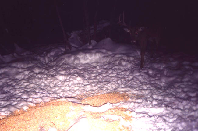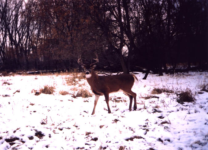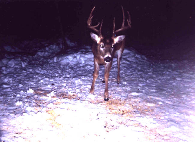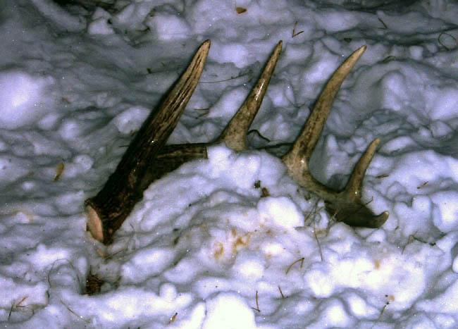 February, 2004. Here's a few nice shed antlers found by Jason Lamppa. The first one is a nice 5 point shed that rough scores 62 7/8". There's also a trail camera photo of this buck while he's still carrying. The next two are a matched set of antlers, both six points each. The left side scores 65 1/8" and the right side goes 68 5/6". Take a look at this dandy buck on the hoof. The 5 point antler in the grass has an impressive 23 1/8" mainbeam. The next one has only three points, but it is one of the heaviest, ugliest 3 point sheds out there. It scored 57". Jason has the other side and also picked up a giant 2 point antler from this same unique buck last year. The last two photos are of a nice 66 7/8" 5 point with some character. As you can see, spotting an antler in deep snow takes a keen eye.