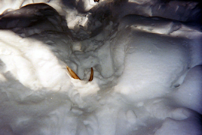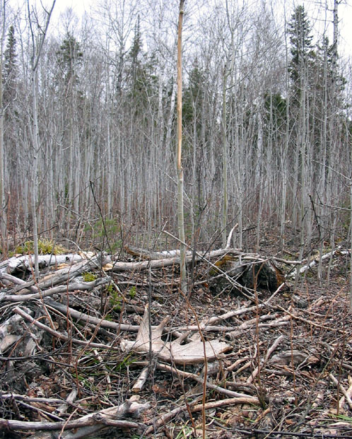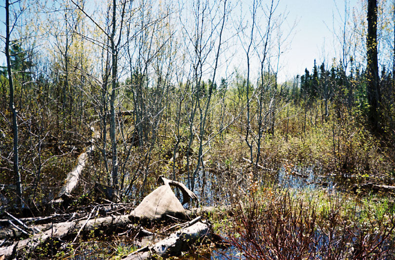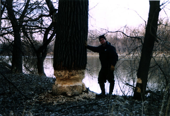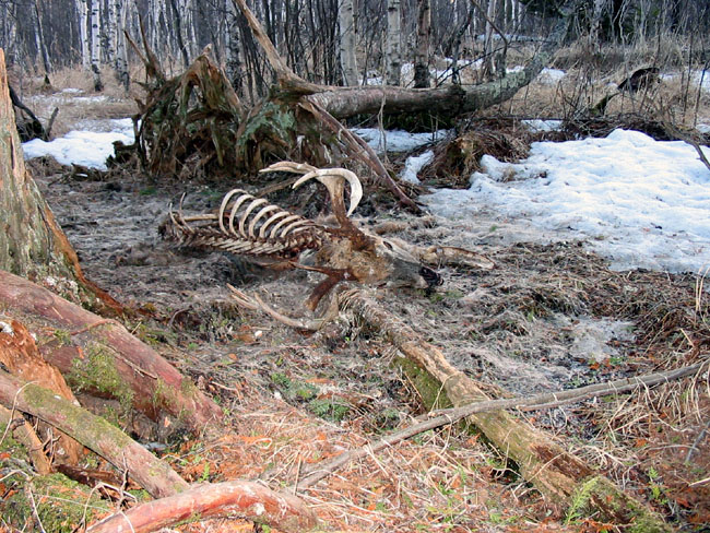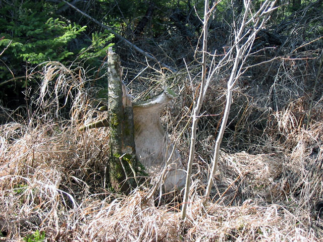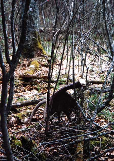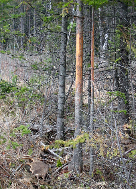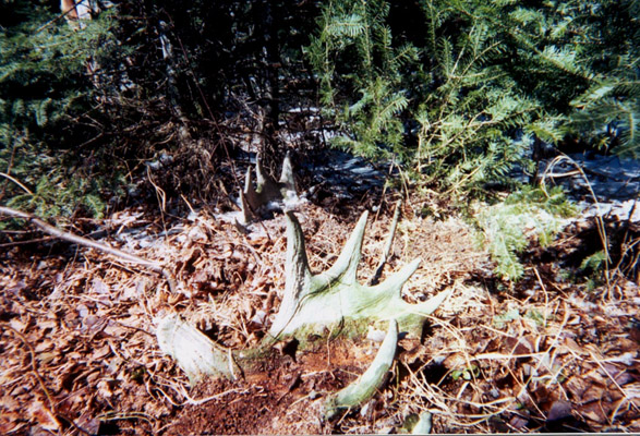 April, 2004. Mike Lindquist made a few discoveries while out shed hunting. The two antlers are both medium sized 5 points. The bigger one would've been over 60 inches if not for the busted G2. A moose skull is a rare find, but this one had already shed his antlers. Check out the damage to the giant tree caused by beavers. This tree is toast.