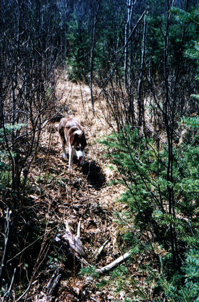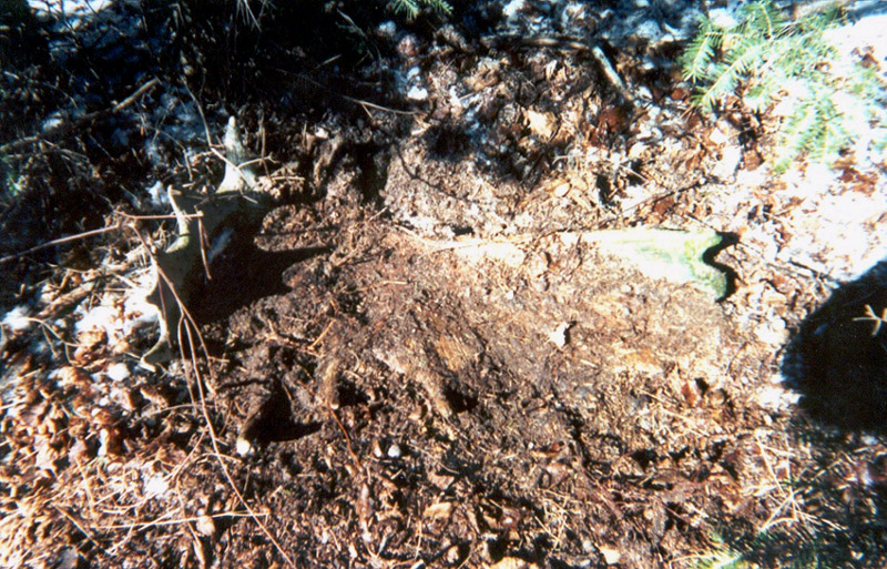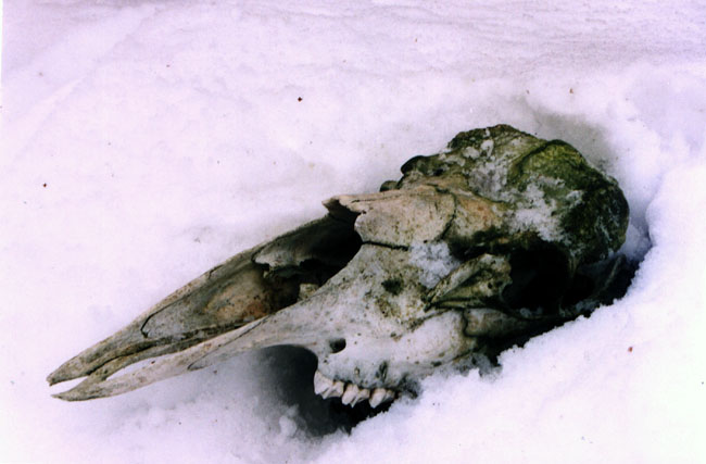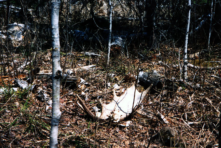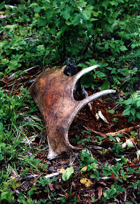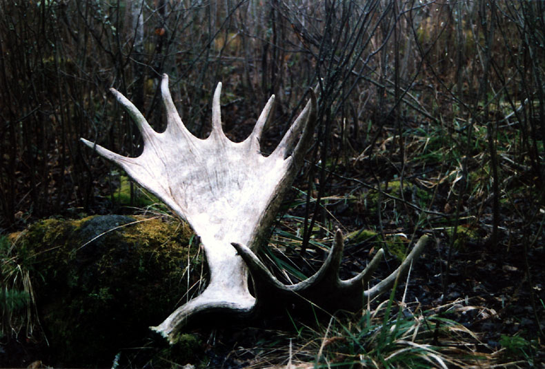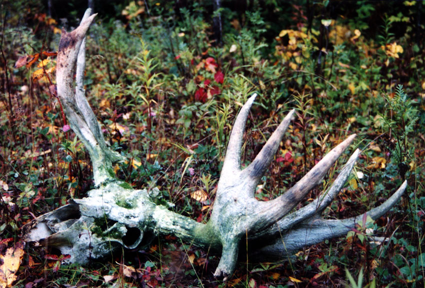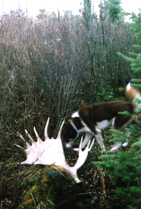 October, 2004. While scouting for deer on his birthday, Mike Lindquist and Lena came across this nice prize. Bull moose skulls with antlers are particularly uncommon to find because bulls have already shed their antlers when they are at their weakest and subject to winterkill. This skull is in rough shape; lots of moss and the paddles are pretty much obliterated by bears, wolves and rodents, but it's still a cool find. It would've measured at least 50 inches across, with multiple brow points and a big drop tine.