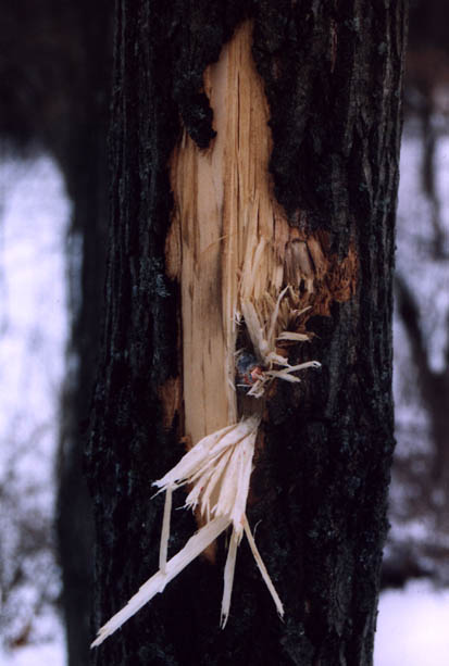 February, 2004. While shed hunting, I came across this interesting find. It's a poplar tree that stopped a bullet. I was able to extract the foreign object and determine that it was a .45 caliber copperjacket hollow point. Strange, considering I was in a State Forest, which is off limits to all methods of hunting.