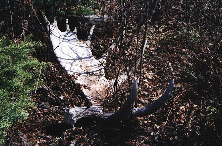 April, 2004. Another nice collection of photos sent in by Chris and Stephanie Potter. After a few days of hard work, they ended up with quite a pile of moose bones, both big and small, fresh and old. The base on the second antler is incredible. The bull moose skull is a find of a season, a definite trophy. The last image is a picturesque site: a beautiful, large, fresh moose antler.