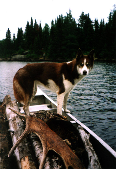 July, 2004. While out on a hike during a camping trip in the Arrowhead, Mike Lindquist and his trusty sidekick Lena stumbled upon an interesting moose antler. It's not a naturally shed antler; but a full paddle that was busted off during a battle. This is a pretty decent sized antler with 8 points and nice color. It would've been neat to witness the two rutting bull moose who locked antlers and left this treasure behind.