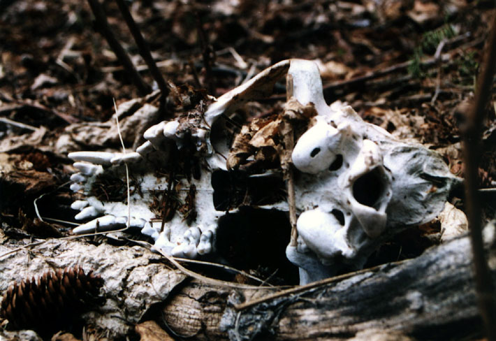 May, 2004. Here's a few nice finds from Mike Lindquist's recent northwoods adventures. The big buck skull is a good one, scoring 144 6/8". This is about as clean of a ten point as you'll see, with less than an inch in total deductions. The next three moose antlers would've been nice to find fresh: a big old paddle with a 9 inch base and a couple faded matching antlers from a 45 inch bull. The last moose antler was a fresh, medium-sized one with fantastic color. The final photograph is an extremely rare find: a timberwolf skull. It was nice and white with the full set of teeth. Scoring it like a bear skull, it measures 15 5/8", a good-sized adult wolf.
