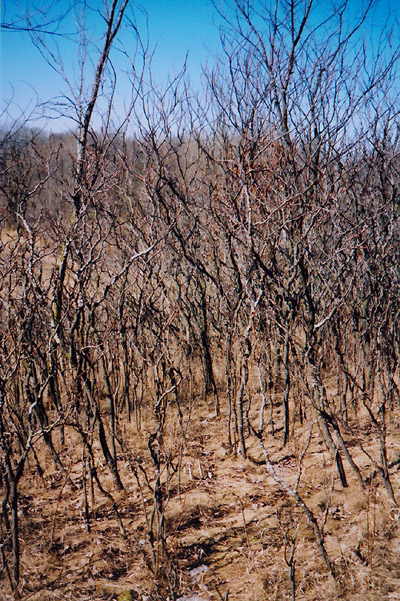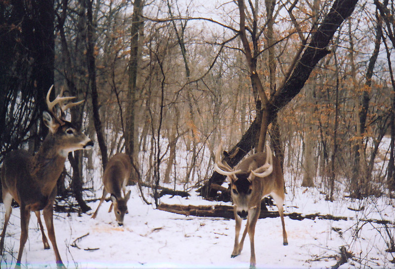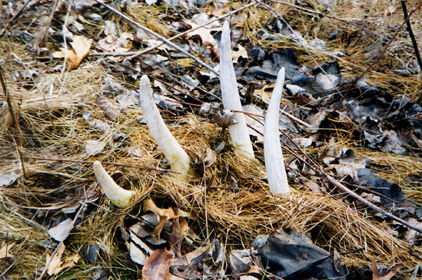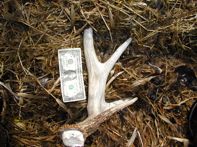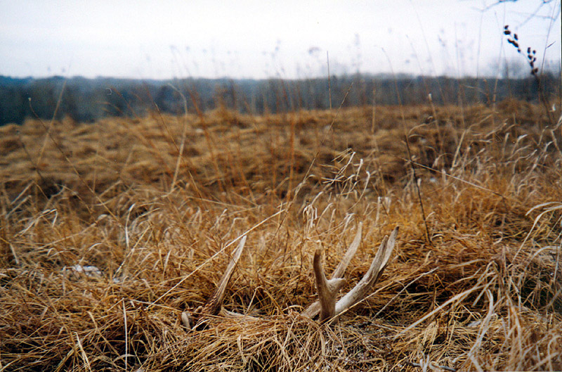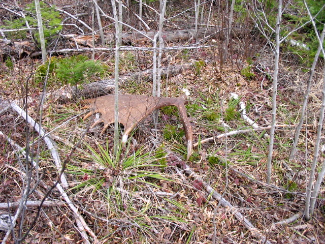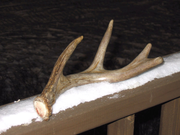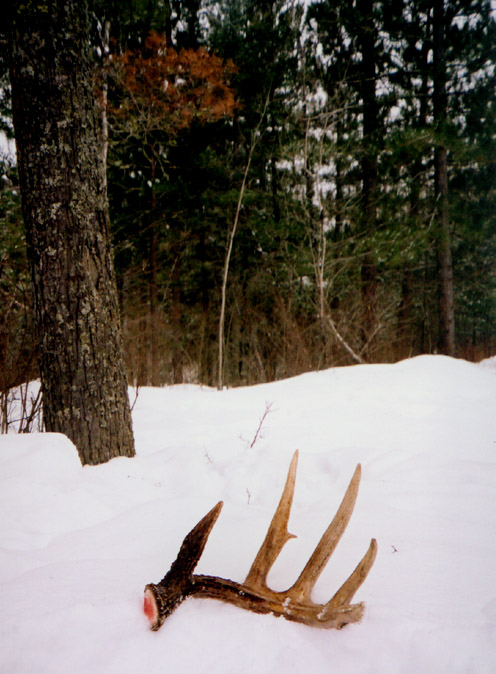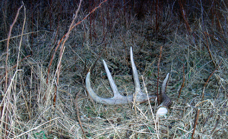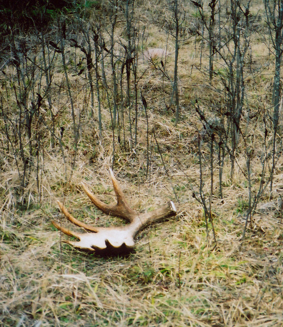 March, 2005. I found a few antlers out there one morning. Nothing huge, but an old medium-sized 5 point side and a busted up 8 point matched set and . I have a photograph of the 8 pointer on the hoof.