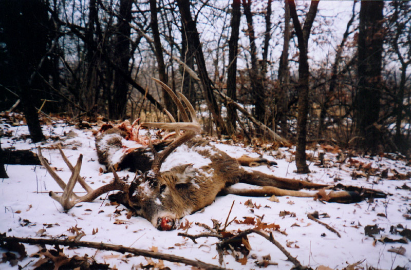 January, 2005. The spirit of the woods was good to me on my first day out for the New Year. I walked up on this tremendous buck. He was lying about 200 yards from where I found his shed antler last year. He did some growing over the year. This buck scores 152" and sports 27 inch mainbeams and a 21 inch inside spread. What an animal.