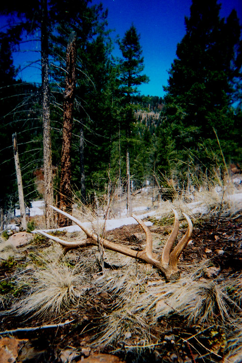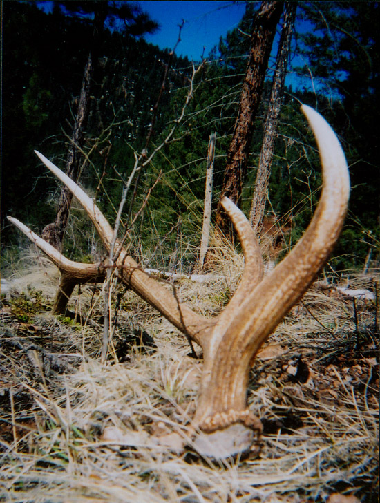 March, 2005. On Easter Sunday I embarked on what I considered a "Mission Impossible": find an elk antler. I was in a place I'd never been before, northern New Mexico. So I went on an egg hunt of my own up in the mountains with only a map and a hunch to guide me. When I walked up on this one, my tired legs and lungs at 8000+ feet became secondary. This six point elk shed is what dreams are made of: big, brown and fresh. The beam is 50 inches; beautiful dark color with polished ivory white tips. Top notch. DC Manwiller and David Galbraith, two fellow outdoorsman back at the camera truck were fully impressed with this gem.