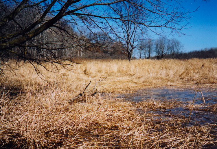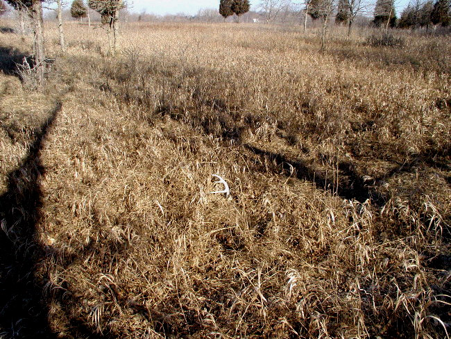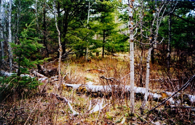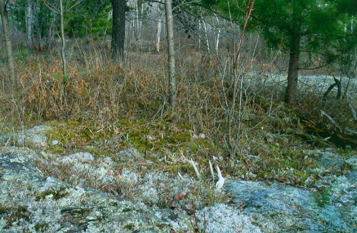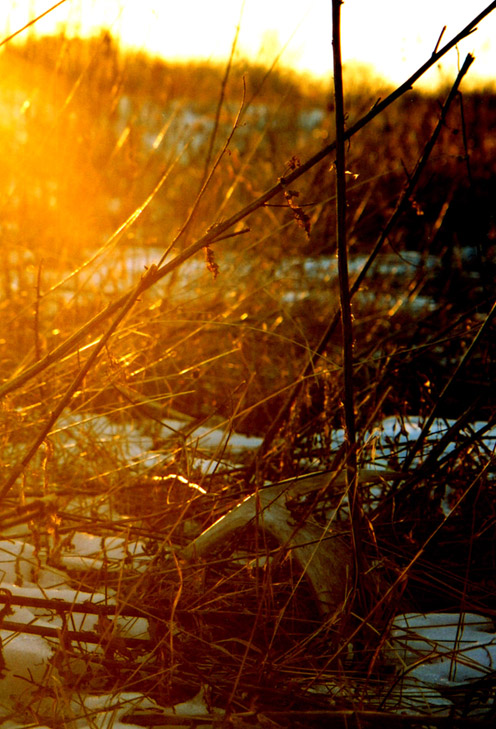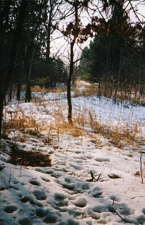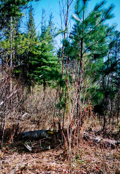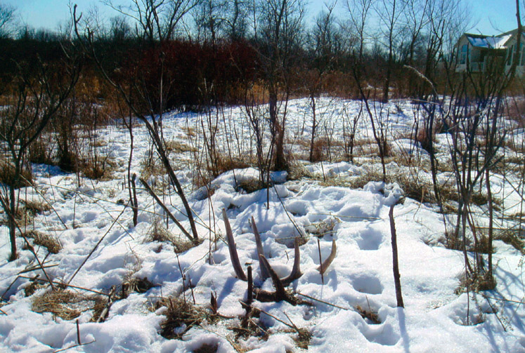 April, 2005. Late season whitetail shed hunting: it's all about expanding your perimeter, taking a different route and covering some of the fringes. Here's some examples of what can happen. The first shed is between a fence line and a pile of old farm machinery. It's the match to an antler I found earlier in the season. The next few are under a highline tower, amidst an old junkyard and just beyond a grocery store parking lot. The last one I've walked past several times in the last 2 years. This time I saw it just because I came at the woods from a different angle. It's old, but heavy: 5 1/2" inch H-measurements and scores 66".