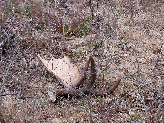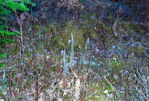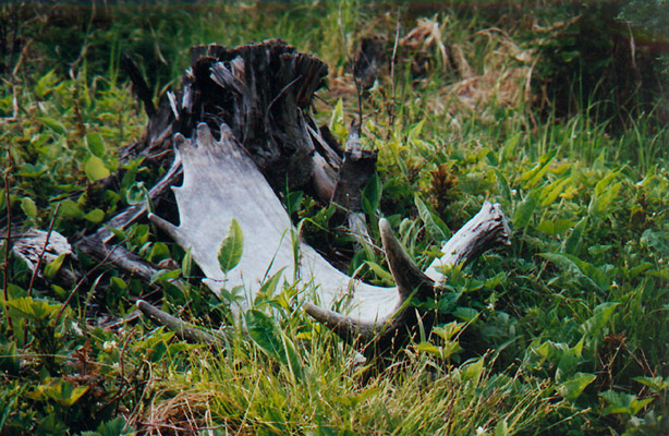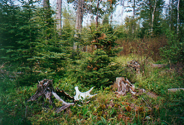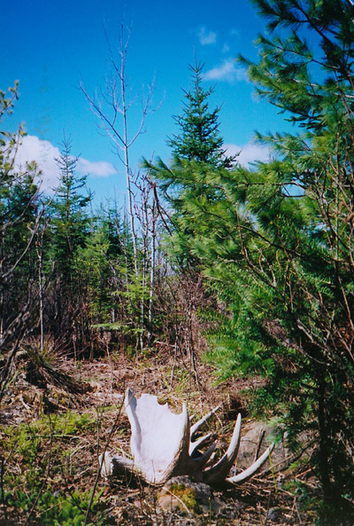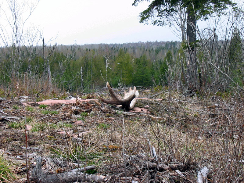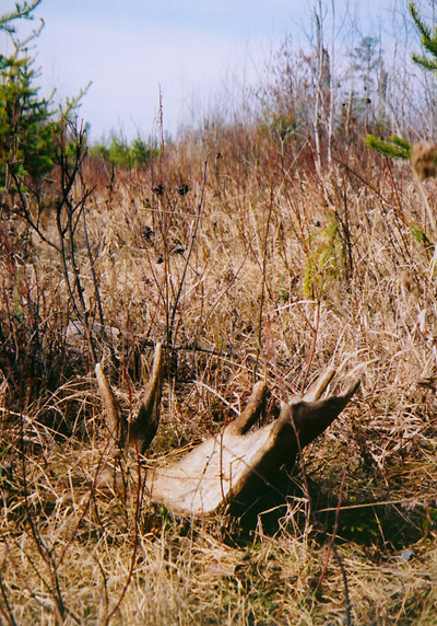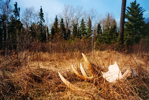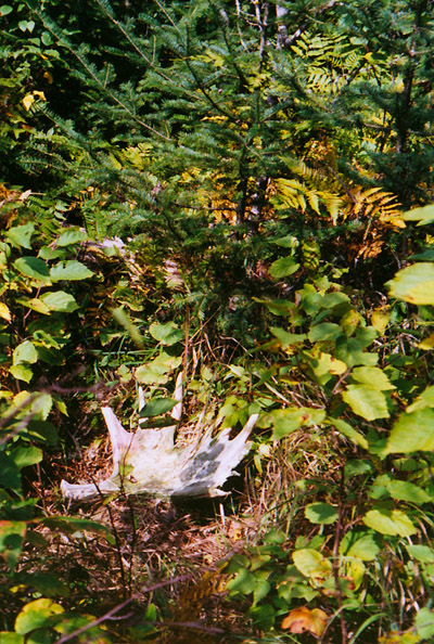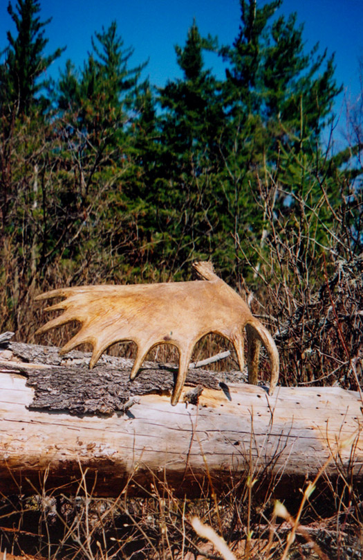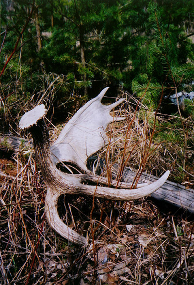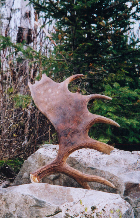 September, 2005. I came across this moose antler while bushwacking around, scouting for the upcoming bow season. The bears got to it first, but it still had some dark brown color on the backside. Made for a nice decoration back at camp under the pines.