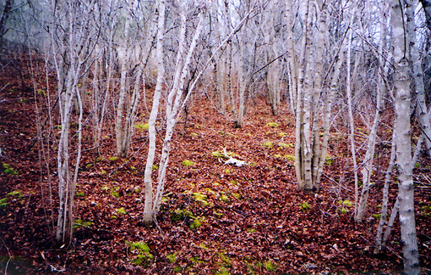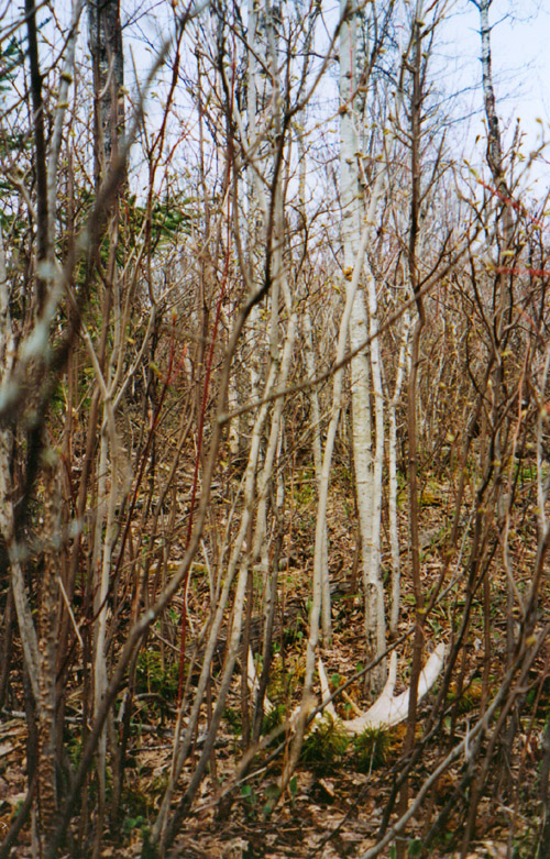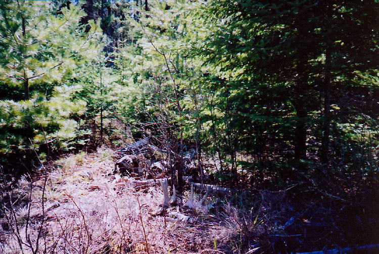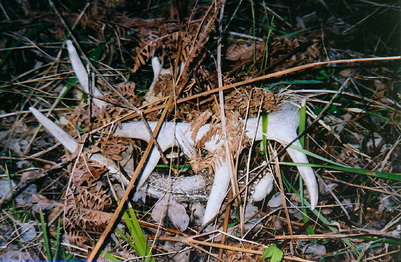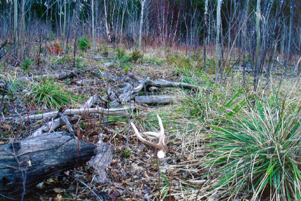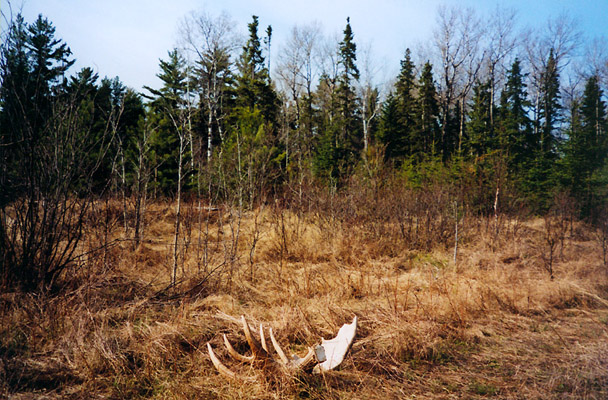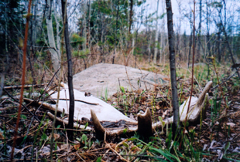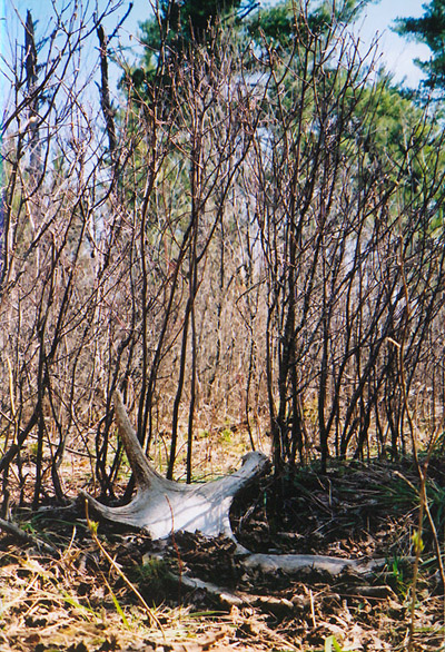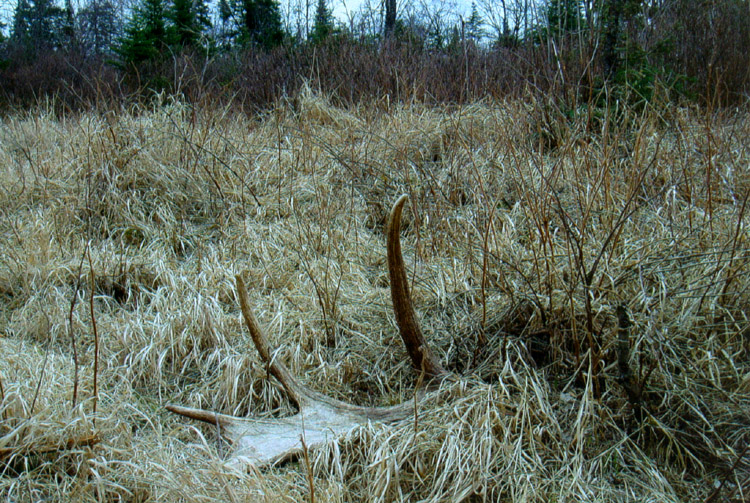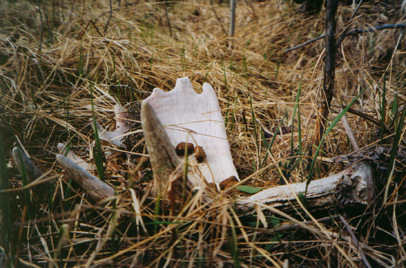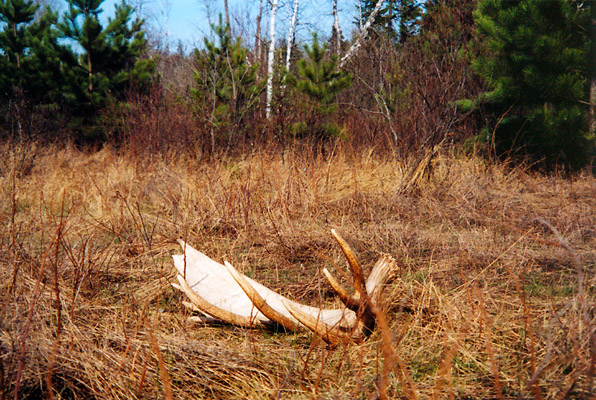 September, 2005. I came across this moose antler while bushwacking around, scouting for the upcoming bow season. The bears got to it first, but it still had some dark brown color on the backside. Made for a nice decoration back at camp under the pines.