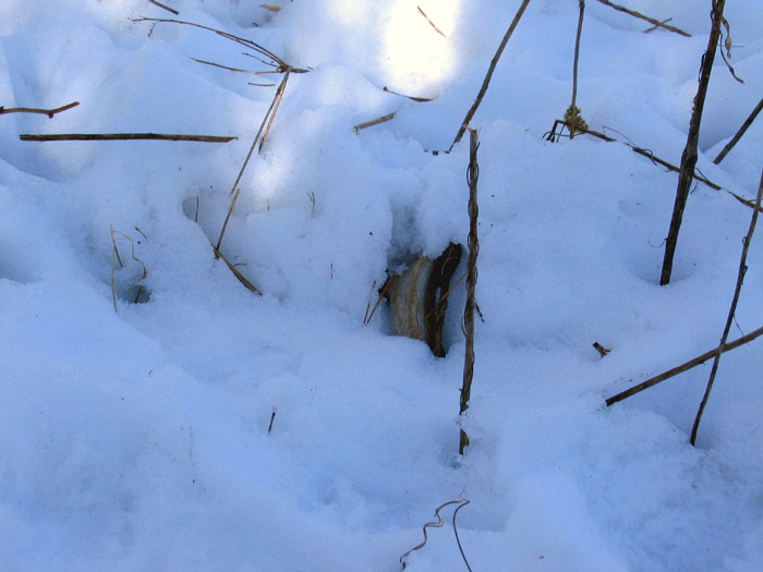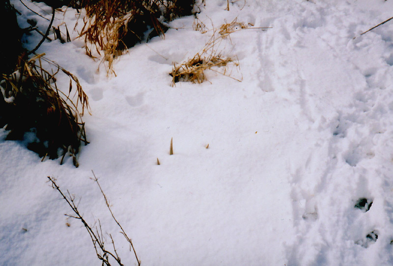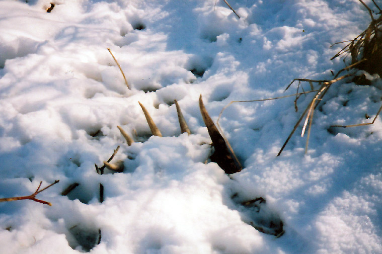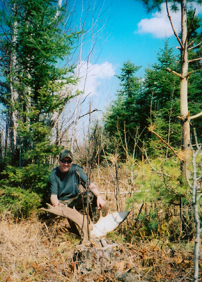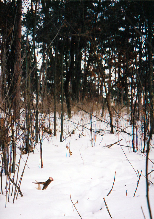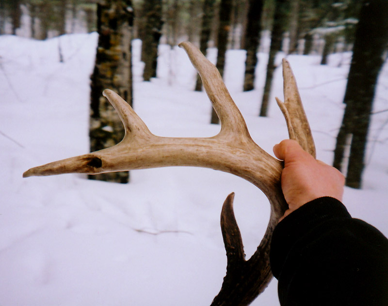 March, 2005. The first photograph here shows what happens when you walk into a northwoods deer yard. This buck shed late, as there's a good 2 feet of snow under the antler. I also found another diamond in the rough, a tall-tined 6pt that goes 72". I'm holding a matched set in my right hand in the last photograph; a real scrubby 7 point.