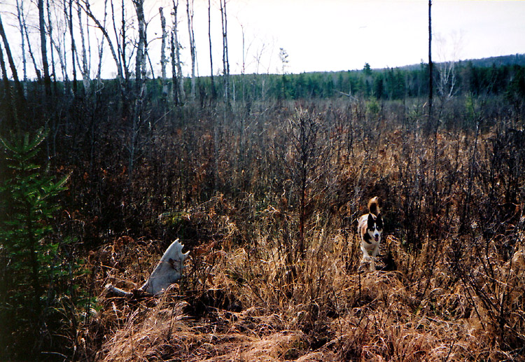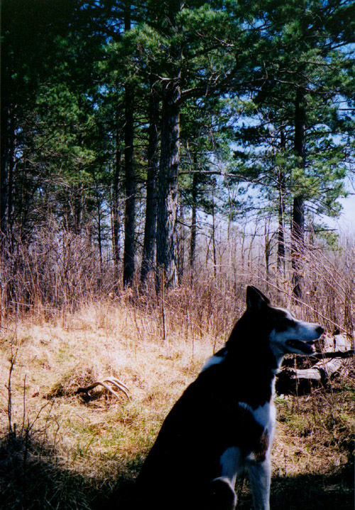 April, 2005. We put up some pretty good numbers on our first trek into moose country: 8 total. We scooped up four nice ones, including a medium-sized matched set before breakfast one morning. As you can see, Lena is bushed. The next day we found the other side to the big one; this bull's spread probably measures 55-58". The matching side is a very unique, self-standing antler with a few nontypical tines drooping down and winging off the side. Later that afternoon, Sasha walked up on a nicely colored matched set, her first ever sheds! We noticed the bulls were really working the small pines to assist in the shedding process.