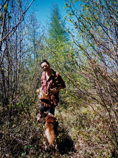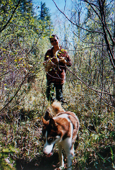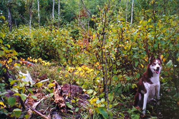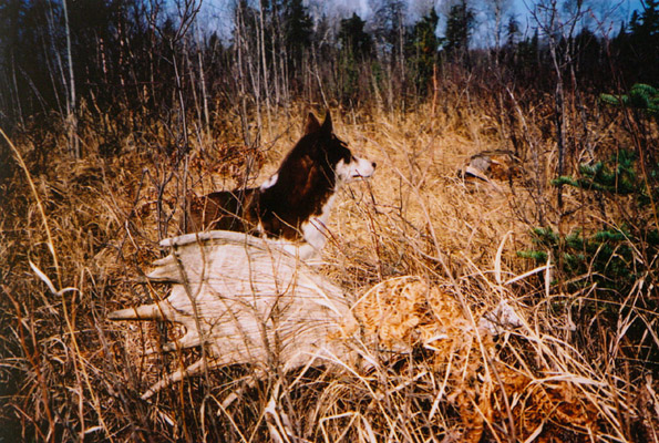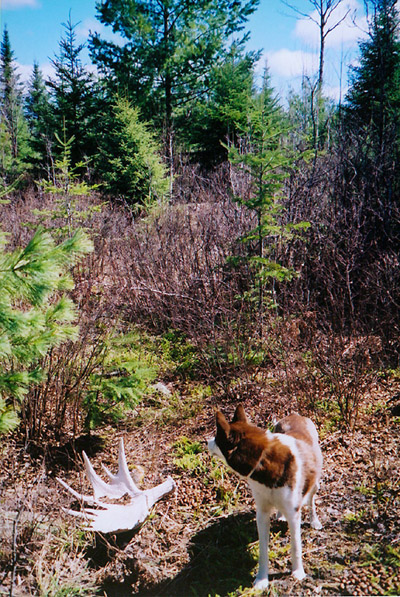 June, 2005. Here are the last moose sheds we found this year. Sasha and Lena with a nice medium sized one found in some thick alders. The bigger shed was number thirty on the year. I called it quits after that. There's also a rare timber wolf skull in there.