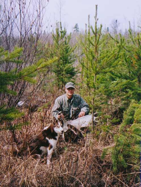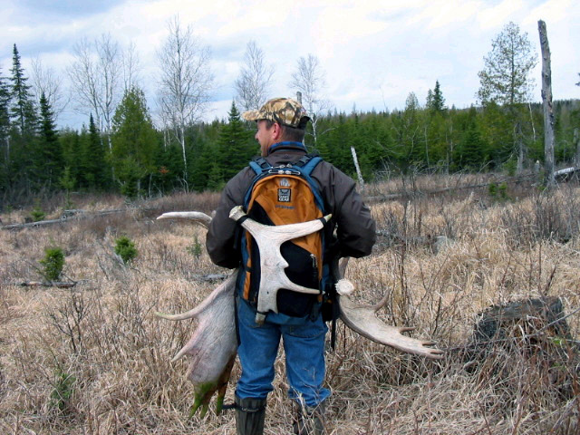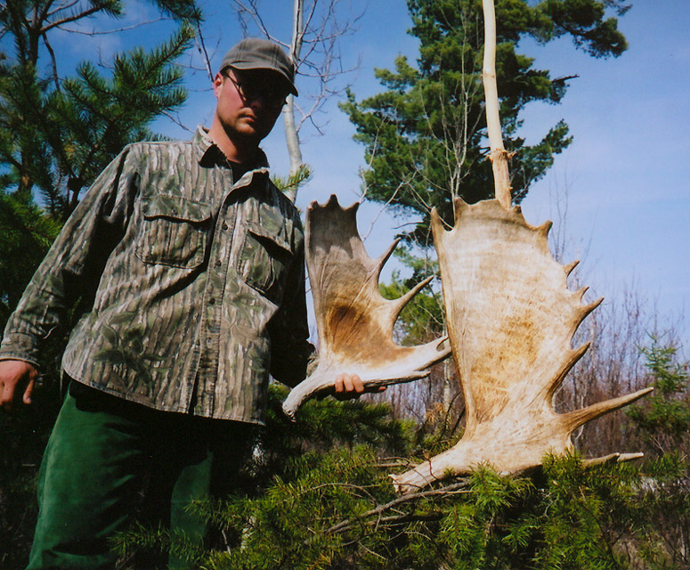 May, 2005. Moose shed hunting is on. Jason Lamppa found a heavy 4 point moose antler and an old, rare find: a bull moose skull. Jim Price found a large white shed and few nice fresh ones. At one rubbed up tree, Jim walked up on two big paddles from two different bulls. Scott Stroyny notched his first moose shed antler ever, a nice white paddle.