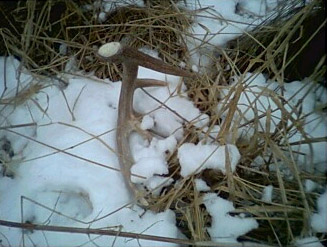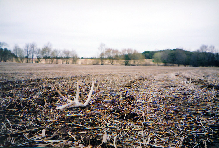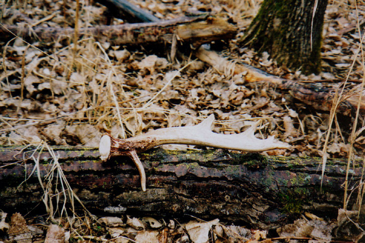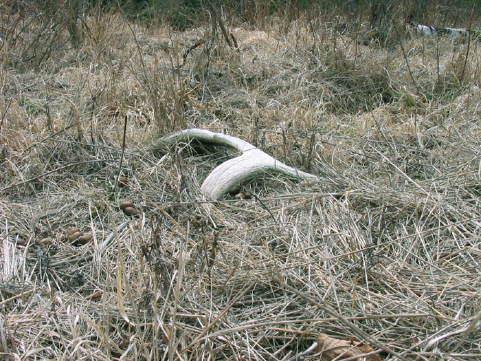 April, 2005. The whitetail shed season is winding down. Here's a couple of the season's final finds. The first one is a neat photo of a shed I found in a cut soybean field. Even though it was lying out in the open, it wasn't easy to spot. Next is a small buck skull. The other shed was even more difficult to see. It was an antler that I have been in search of for several months. It's a 60+ inch 5 point side with a kicker point off the G2. I found the right side to this nice 10pt. buck while bowhunting last fall.