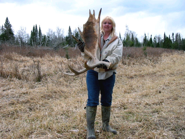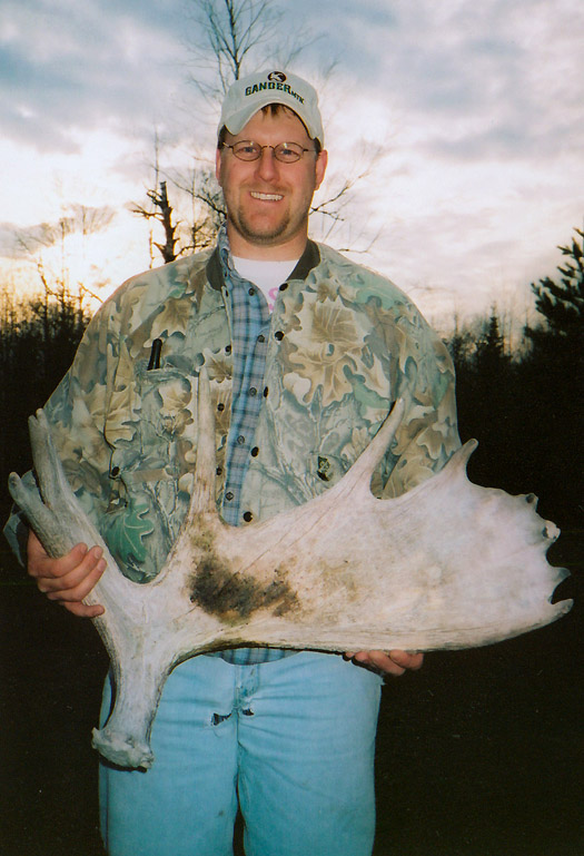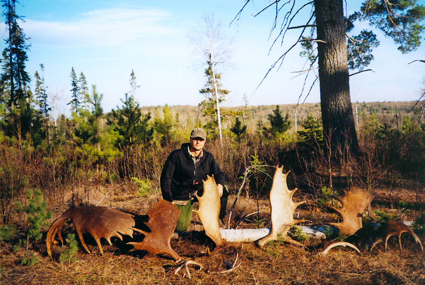 April, 2005. After some time spent deep in moose country, the Potter's came out of there with a bunch of nice moose paddles. There's a big old one with an impressive triple brow tine and a nice matched set in there. Chris is holding two really heavy-based moose antlers from a couple mature bulls. Looks like a couple nice outtings!